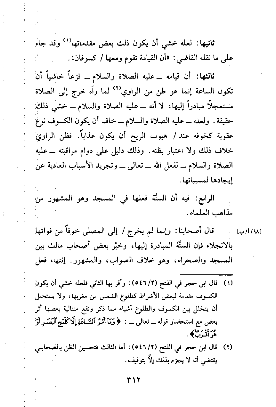 (¬1) قال ابن حجر في الفتح (2/ 546): وأقر بها الثاني فلعله خشي أن يكون الكسوف مقدمة لبعض الأشراط كطلوع الشمس من مغربها، ولا يستحيل أن يتخلل بين الكسوف والطلوع أثناء مما ذكر وتقع مسألة بعضها أثر بعض مع استحضار قوله -تعالى-: {وَمَا أَمْرُ السَّاعَةِ إِلَّا كَلَمْحِ الْبَصَرِ أَوْ هُوَ أَقْرَبُ}.