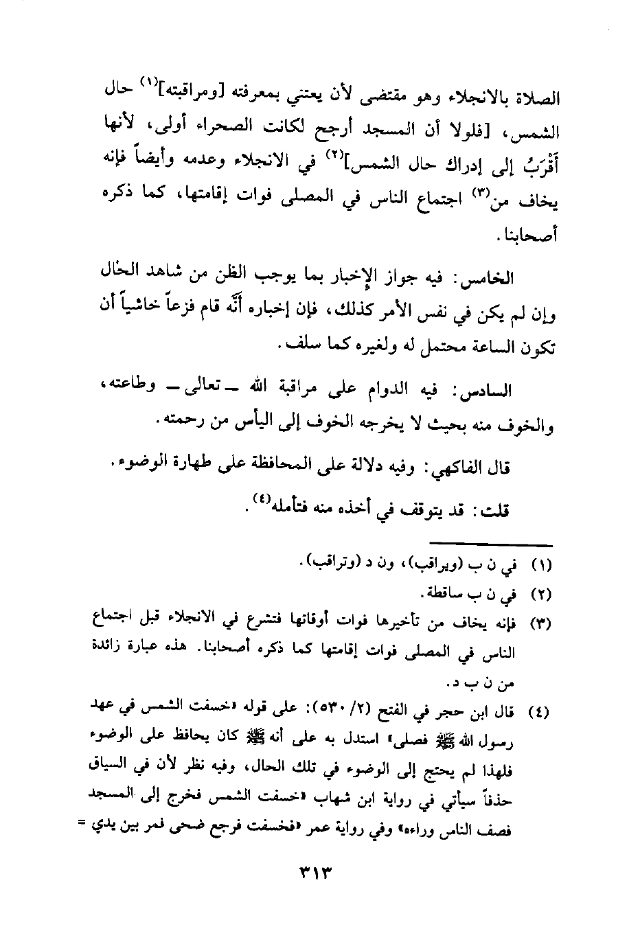 (¬4) قال ابن حجر في الفتح (2/ 530): على قوله "خسفت الشمس في عهد رسول الله - صلى الله عليه وسلم - فصلى، استدل به على أنه - صلى الله عليه وسلم - كان يحافظ على الوضوء فلهذا لم يحتج إلى الوضوء في تلك الحال، وفيه نظر لأن في السياق حذفًا سيأتي في رواية ابن شهاب "خسفت الشمس فخرج إلى المسجد فصف الناس وراءه" وفي رواية عمر "فخسفت فرجع ضحى فمر بين يدي =