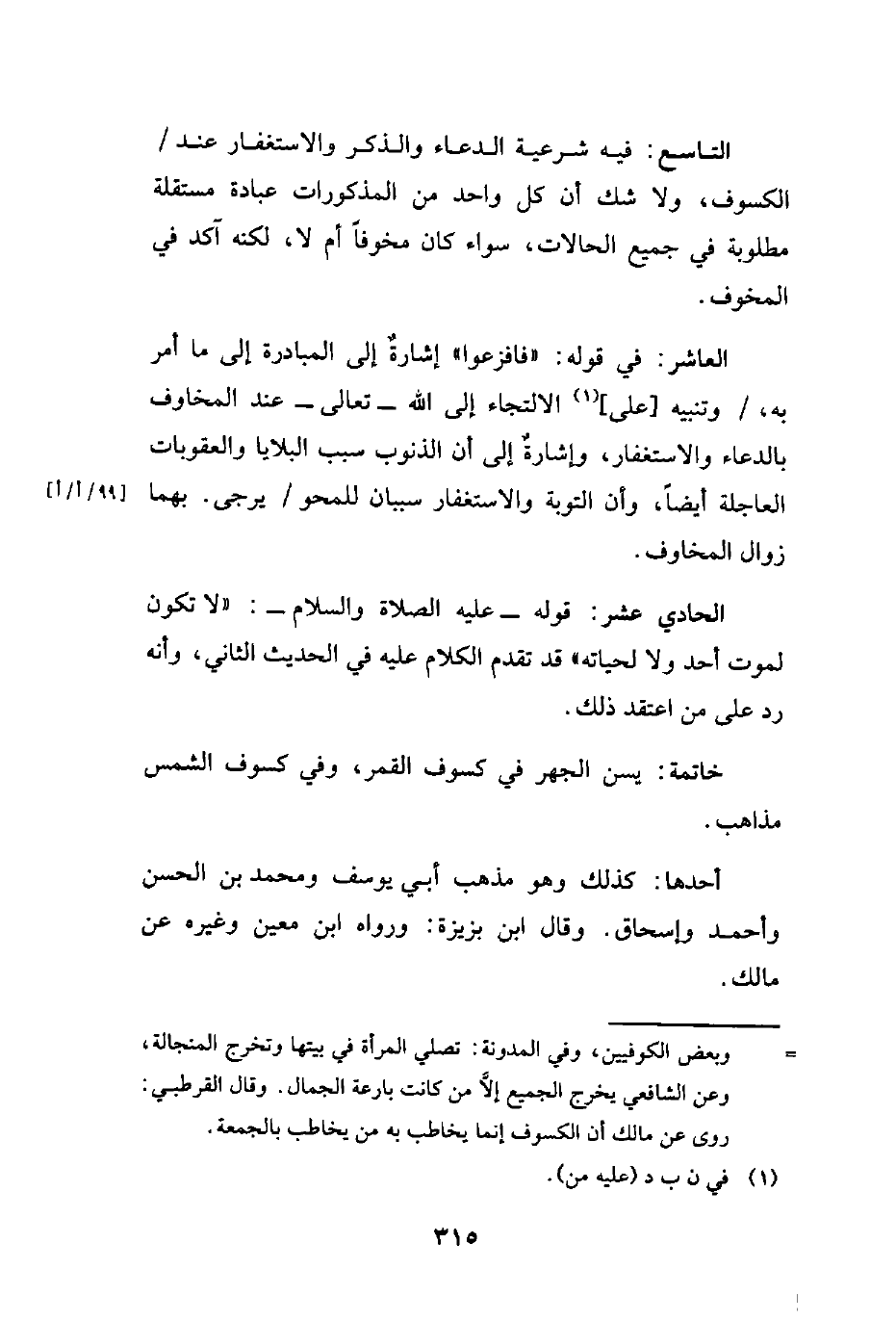 التاسع: فيه شرعية الدعاء والذكر والاستغفار عند الكسوف، ولا شك أن كل واحد من المذكورات عبادة مستقلة مطلوبة في جميع الحالات، سواء كان مخوفًا أم لا، لكنه آكد في المخوف.