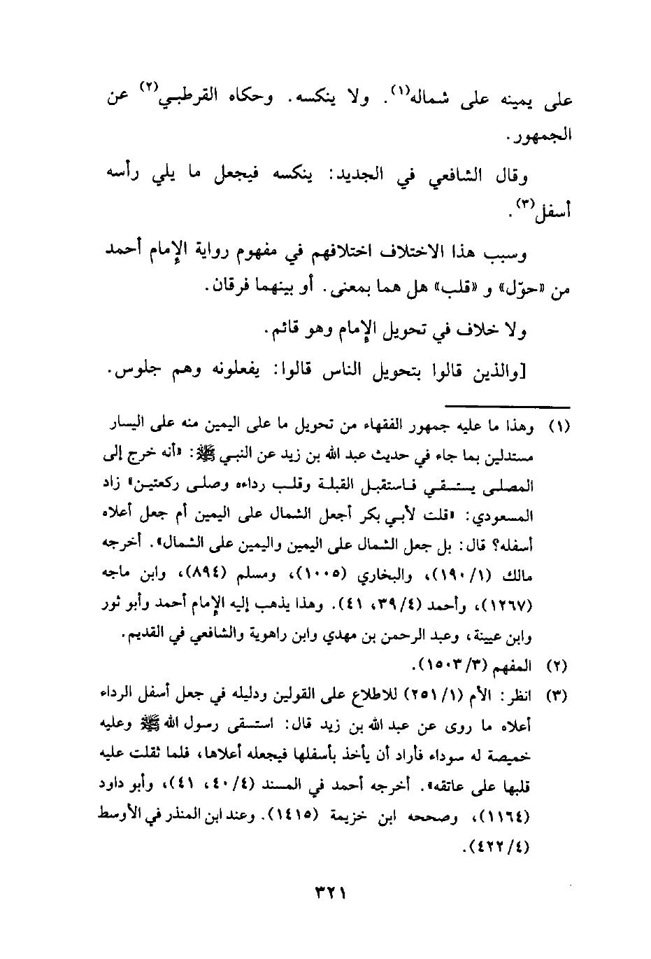 (¬3) انظر: الأم (1/ 251) للاطلاع على القولين ودليله في جعل أسفل الرداء أعلاه ما روى عن عبد الله بن زيد قال: استسقى رسول الله - صلى الله عليه وسلم - وعليه خميصة له سوداء فأراد أن يأخذ بأسفلها فيجعله أعلاها، فلما ثقلت عليه قلبها على عاتقه". أخرجه أحمد في المسند (4/ 40، 41)، وأبو داود (1164)، وصححه ابن خزيمة (1415). وعند ابن المنذر في الأوسط (4/ 422).