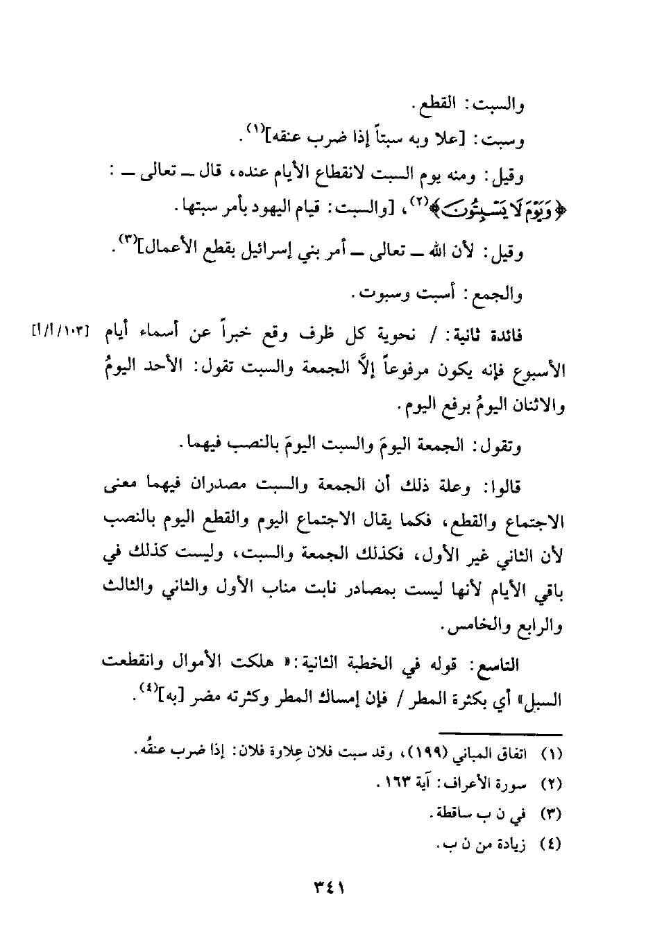 وقيل: ومنه يوم السبت لانقطاع الأيام عنده، قال -تعالى-: {وَيَوْمَ لَا يَسْبِتُونَ} (¬2)، [والسبت: قيام اليهود بأمر سبتها.