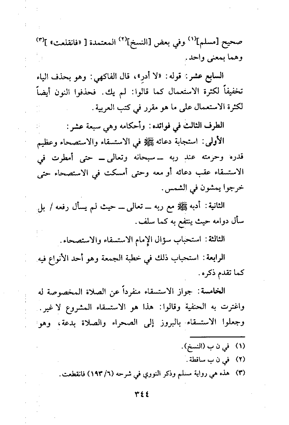 الأولى: استجابة دعائه - صلى الله عليه وسلم - في الاستسقاء والاستصحاء وعظيم قدره وحرمته عند ربه -سبحانه وتعالى- حتى أمطرت في الاستسقاء عقب دعائه أومعه وحتى أمسكت في الاستصحاء حتى خرجوا يمشون في الشمس.