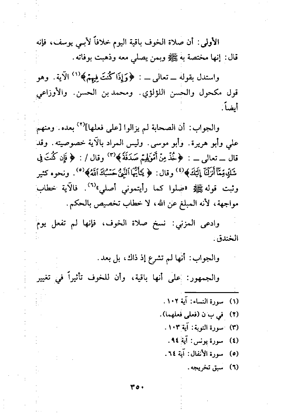 واستدل بقوله -تعالى-: {وَإِذَا كُنْتَ فِيهِمْ} (¬1) الآية. وهو قول مكحول والحسن اللؤلؤي. ومحمد بن الحسن. والأوزاعي أيضًا. والجواب: أن الصحابة لم يزالوا [على فعلها] (¬2) بعده. ومنهم علي وأبو هريرة. وأبو موسى. وليس المراد بالآية خصوصيته. وقد قال -تعالى-: {خُذْ مِنْ أَمْوَالِهِمْ صَدَقَةً} (¬3) وقال: {فَإِنْ كُنْتَ فِي شَكٍّ مِمَّا أَنْزَلْنَا إِلَيْكَ} (¬4) وقال: {يَا أَيُّهَا النَّبِيُّ حَسْبُكَ اللَّهُ} (¬5). ونحوه كثير وثبت قوله - صلى الله عليه وسلم - "صلوا كما رأيتموني أصلي" (¬6). فالآية خطاب مواجهة، لأنه المبلغ عن الله، لا خطاب تخصيص بالحكم.