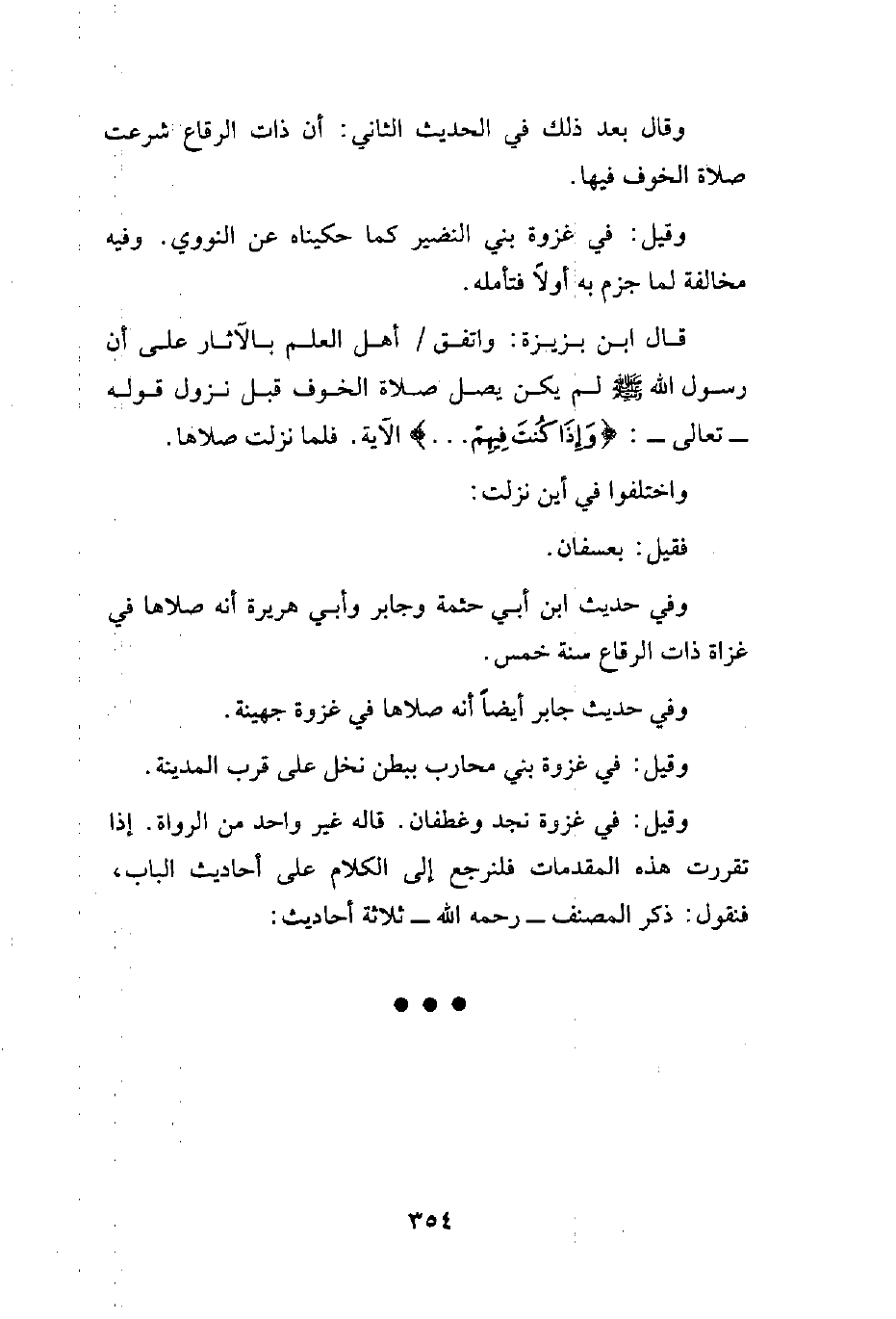 وقيل: في غزوة نجد وغطفان. قاله غير واحد من الرواة. إذا تقررت هذه المقدمات فلنرجع إلى الكلام على أحاديث الباب، فنقول: ذكر المصنف -رحمه الله- ثلاثة أحاديث: