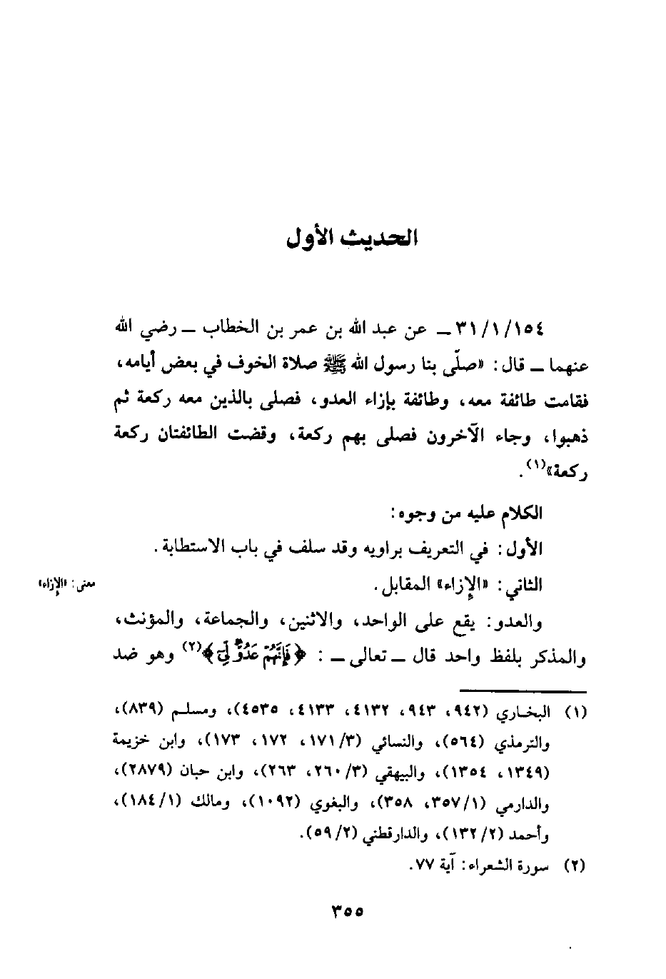 154/ 1/ 31 - عن عبد الله بن عمر بن الخطاب - رضي الله عنهما - قال: "صلَّى بنا رسول الله - صلى الله عليه وسلم - صلاة الخوف في بعض أيامه، فقامت طائفة معه، وطائفة بإزاء العدو، فصلى بالذين معه ركعة ثم ذهبوا، وجاء الآخرون فصلى بهم ركعة، وقضت الطائفتان ركعة ركعة" (¬1).