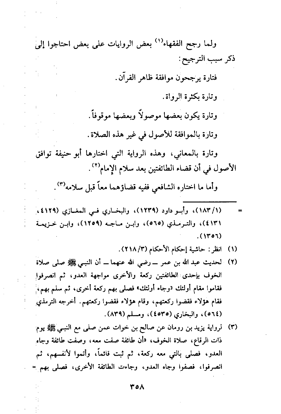 (¬2) لحديث عبد الله بن عمر - رضي الله عنهما - أن النبي - صلى الله عليه وسلم - صلى صلاة الخوف بإحدى الطائفتين ركعة والأخرى مواجهة العدو، ثم انصرفوا فقاموا مقام أولئك "وجاء أولئك" فصلى بهم ركعة أخرى، ثم سلم بهم، فقام هؤلاء فقضوا ركعتهم، وقام هؤلاء فقضوا ركعتهم. أخرجه الترمذي (564)، والبخاري (4535)، ومسلم (839).