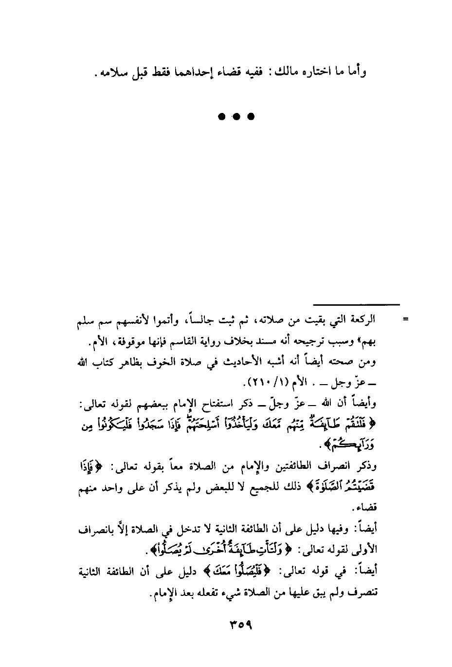= الركعة التي بقيت من صلاته، ثم ثبت جالسًا، وأتموا لأنفسهم ثم سلم بهم" وسبب ترجيحه أنه مسند بخلاف رواية القاسم فإنها موقوفة، الأم. ومن صحته أيضًا أنه أشبه الأحاديث في صلاة الخوف بظاهر كتاب الله -عزّ وجل-. الأم (1/ 210). وأيضًا أن الله -عزّ وجل- ذكر استفتاح الإِمام ببعضهم لقوله تعالى: {فَلْتَقُمْ طَائِفَةٌ مِنْهُمْ مَعَكَ وَلْيَأْخُذُوا أَسْلِحَتَهُمْ فَإِذَا سَجَدُوا فَلْيَكُونُوا مِنْ وَرَائِكُمْ}.