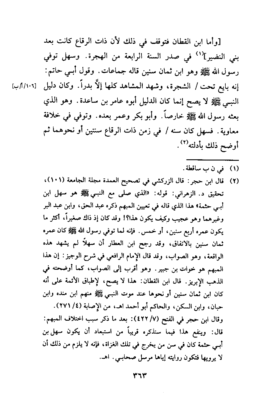 [وأما ابن القطان فتوقف في ذلك لأن ذات الرقاع كانت بعد بني النضير] (¬1) في صدر السنة الرابعة من الهجرة. وسهل توفي رسول الله - صلى الله عليه وسلم - وهو ابن ثمان سنين قاله جماعات. وقول أبي حاتم: إنه بايع تحت الشجرة، وشهد المشاهد كلها إلَّا بدرًا. وكان دليل النبي - صلى الله عليه وسلم - لا يصح إنما كان الدليل أبوه عامر بن ساعدة. وهو الذي بعثه رسول الله - صلى الله عليه وسلم - خارصًا. وأبو بكر وعمر بعده. وتوفي في خلافة معاوية. فسهل كان سنه في زمن ذات الرقاع سنتين أو نحوهما ثم أوضح ذلك بأدلته (¬2).