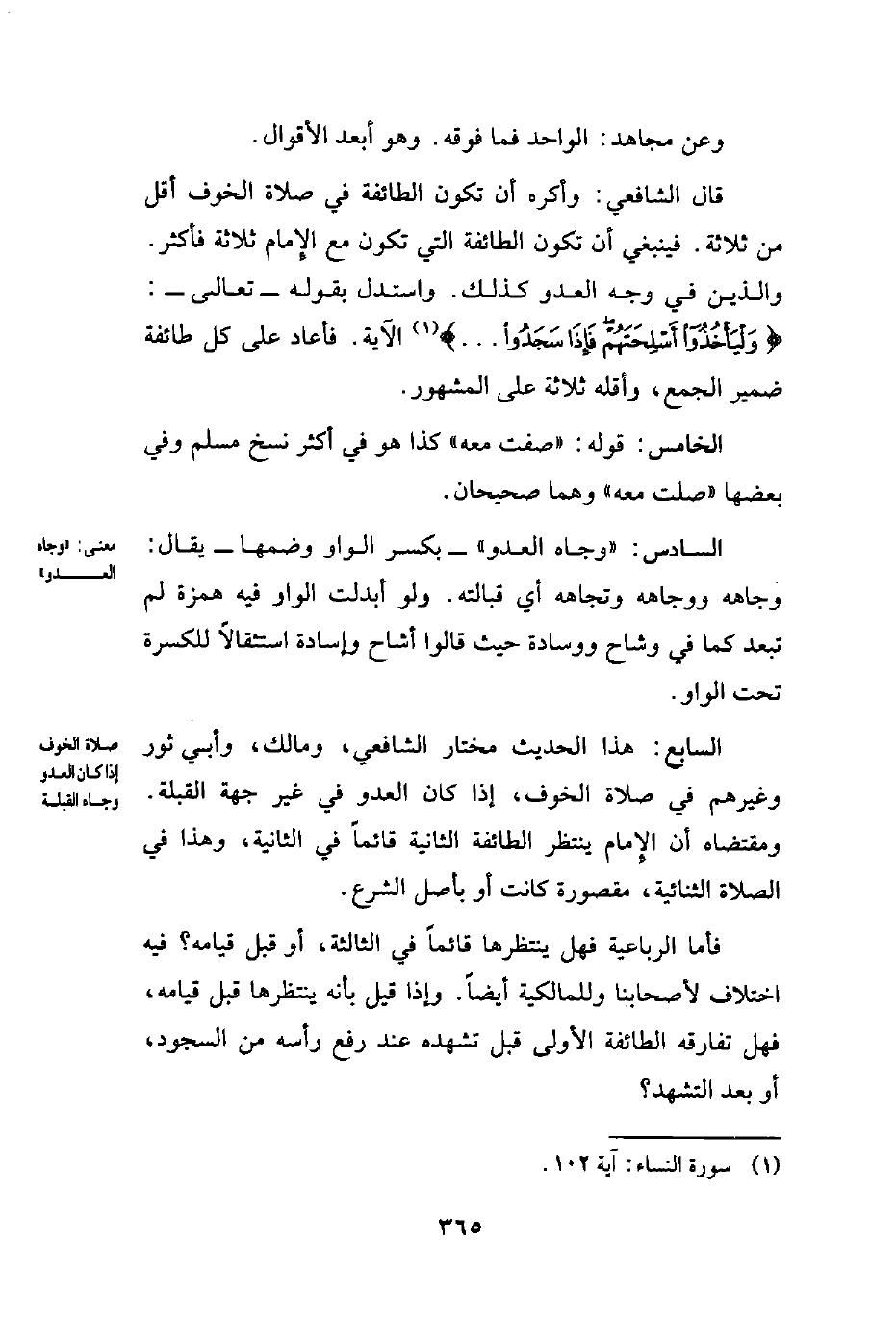 السابع: هذا الحديث مختار الشافعي، ومالك، وأبي ثور وغيرهم في صلاة الخوف، إذا كان العدو في غير جهة القبلة. ومقتضاه أن الإِمام ينتظر الطائفة الثانية قائمًا في الثانية، وهذا في الصلاة الثنائية، مقصورة كانت أو بأصل الشرع.