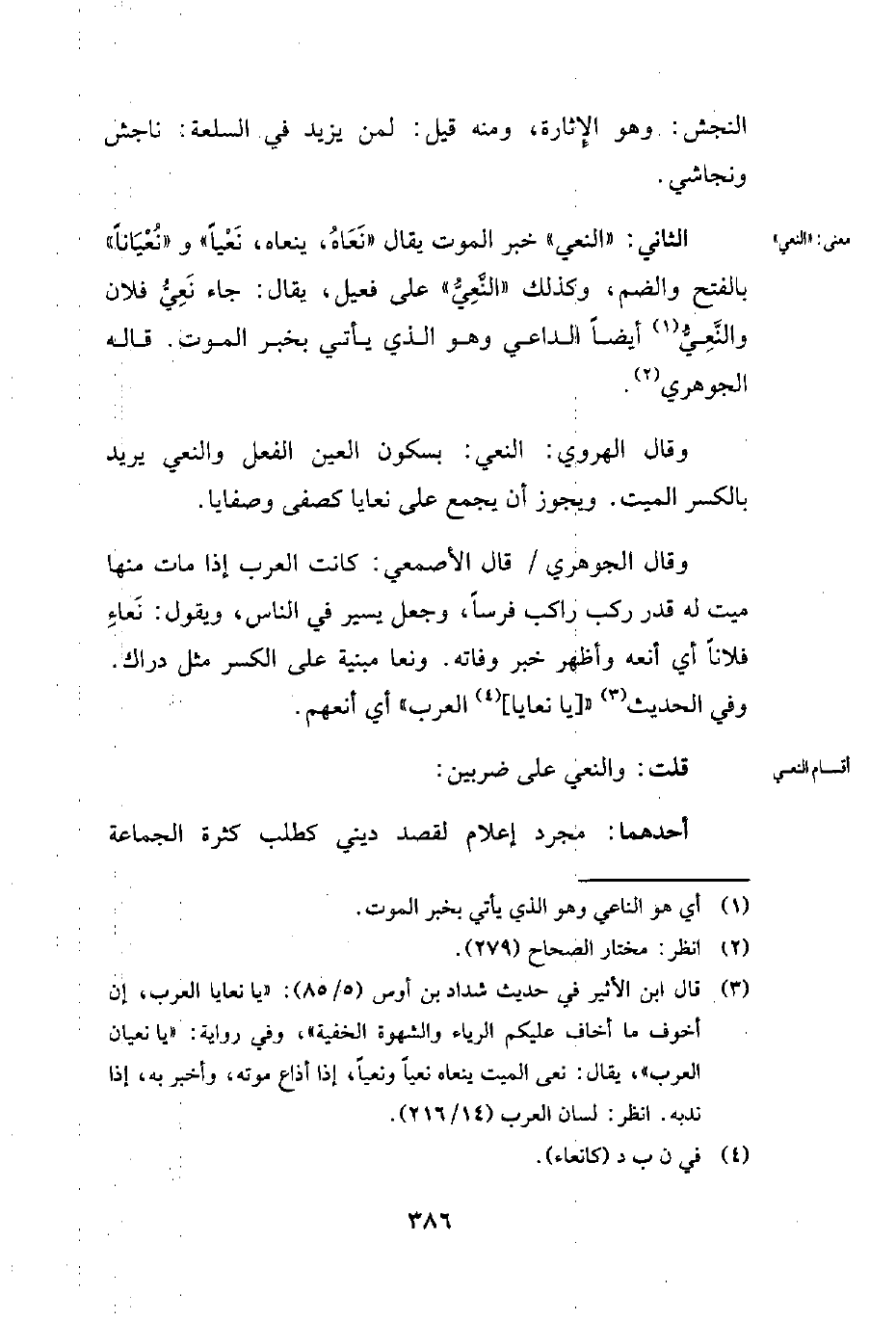 (¬3) قال ابن الأثير في حديث شداد بن أوس (5/ 85): "يا نعايا العرب، إن أخوف ما أخاف عليكم الرياء والشهوة الخفية"، وفي رواية: [يا نعيان العرب"، يقال: نعى الميت ينعاه نعيًا ونعيًا، إذا أذاع موته، وأخبر به، إذا ندبه. انظر: لسان العرب (14/ 216).