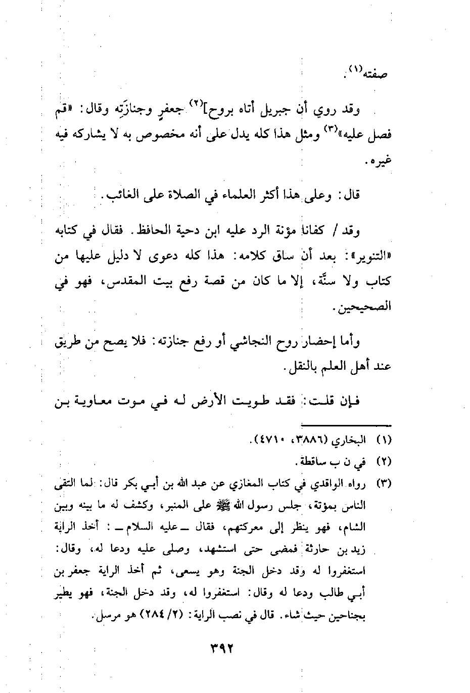 (¬3) رواه الواقدي في كتاب المغازي عن عبد الله بن أبي بكر قال: لما التقى الناس بمؤتة، جلس رسول الله - صلى الله عليه وسلم - على المنبر، وكشف له ما بينه وبين الشام، فهو ينظر إلى معركتهم، فقال - عليه السلام -: أخذ الراية زيد بن حارثة فمضى حتى استشهد، وصلى عليه ودعا له، وقال: استغفروا له وقد دخل الجنة وهو يسعى، ثم أخذ الراية جعفر بن أبي طالب ودعا له وقال: استغفروا له، وقد دخل الجنة، فهو يطير بجناحين حيث شيء. قال في نصب الراية: (2/ 284) هو مرسل.