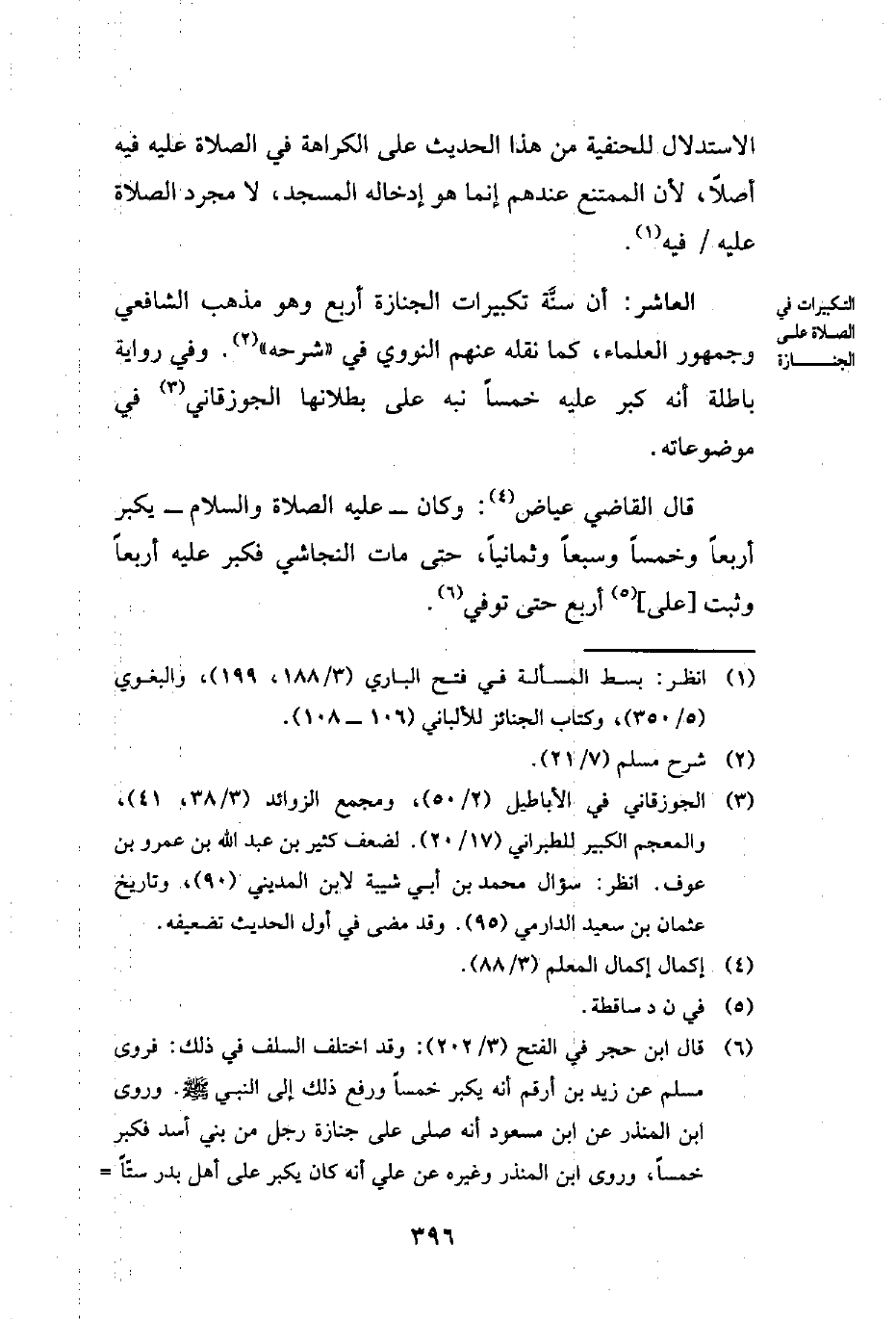 (¬6) قال ابن حجر في الفتح (3/ 202): وقد اختلف السلف في ذلك: فروى مسلم عن زيد بن أرقم أنه يكبر خمسًا ورفع ذلك إلى النبي - صلى الله عليه وسلم -. وروى ابن المنذر عن ابن مسعود أنه صلى على جنازة رجل من بني أسد فكبر خمسًا، وروى ابن المنذر وغيره عن علي أنه كان يكبر على أهل بدر ستًّا =