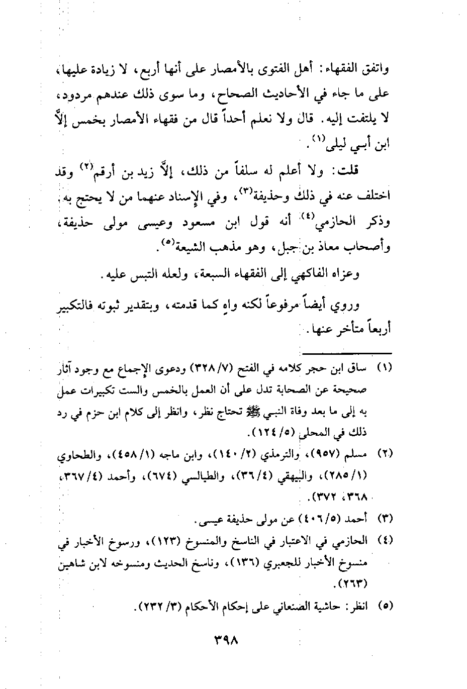 (¬1) ساق ابن حجر كلامه في الفتح (7/ 328) ودعوى الإِجماع مع وجود آثار صحيحة عن الصحابة تدل على أن العمل بالخمس والست تكبيرات عمل به إلى ما بعد وفاة النبي -صلى الله عليه وسلم- تحتاج نظر، وانظر إلى كلام ابن حزم في رد ذلك في المحلى (5/ 124).