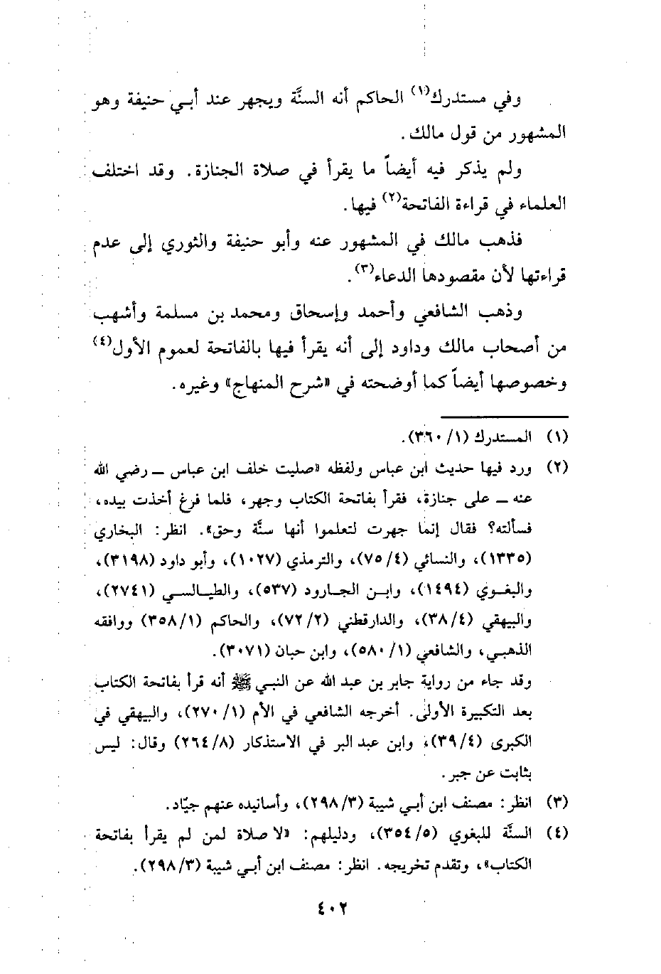 (¬2) ورد فيها حديث ابن عباس ولفظه "صليت خلف ابن عباس - رضي الله عنه - على جنازة، فقرأ بفاتحة الكتاب وجهر، فلما فرغ أخذت بيده، فسألته؟ فقال إنما جهرت لتعلموا أنها سنَّة وحق". انظر: البخاري (1335)، والنسائي (4/ 75)، والترمذي (1027)، وأبو داود (3198)، والبغوي (1494)، وابن الجارود (537)، والطيالسي (2741)، والبيهقي (4/ 38)، والدارقطني (2/ 72)، والحاكم (1/ 358) ووافقه الذهبي، والشفعي (1/ 580)، وابن حبان (3071).
