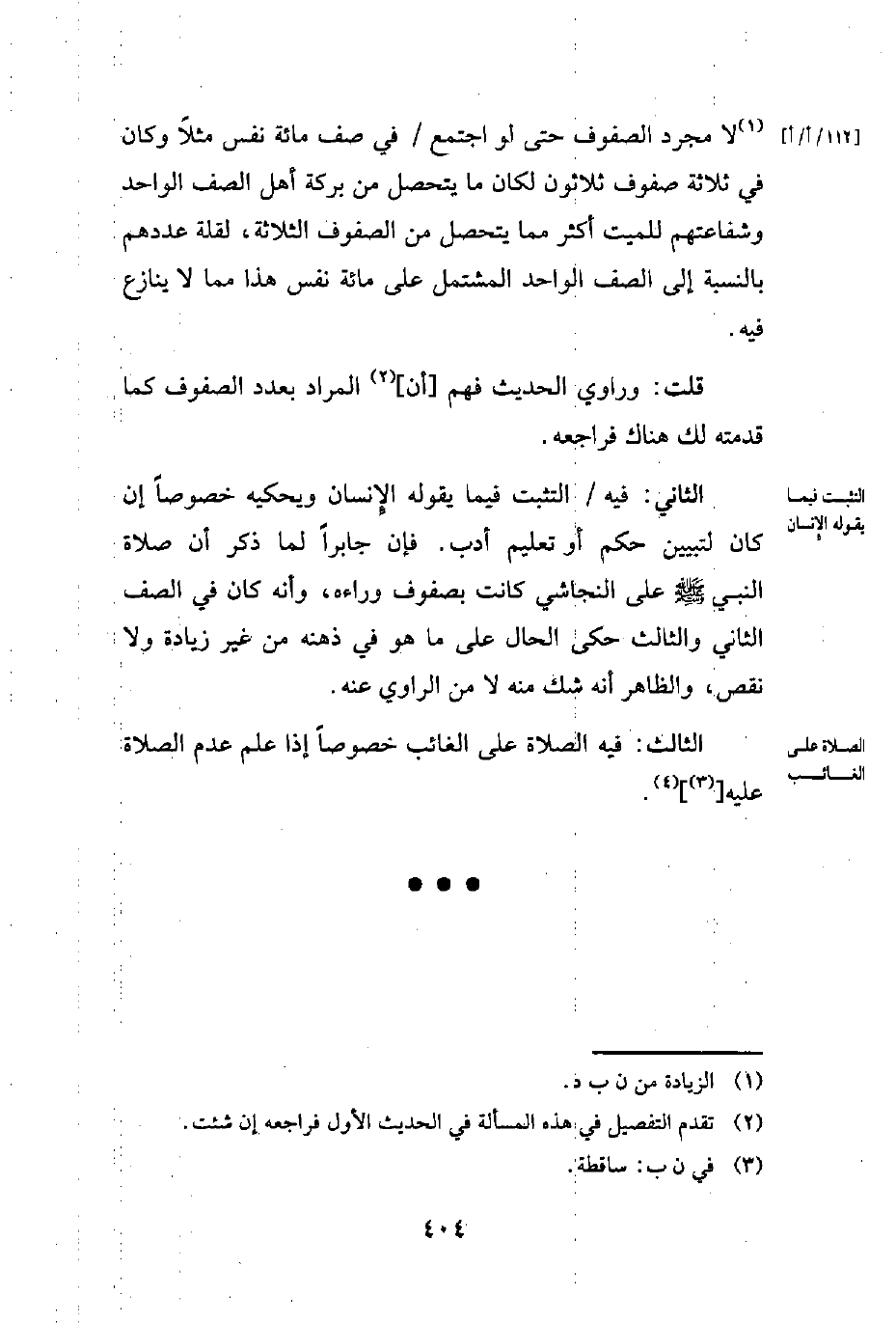 الثاني: فيه التثبت فيما يقوله الإِنسان ويحكيه خصوصًا إن كان لتبيين حكم أو تعليم أدب. فإن جابرًا لما ذكر أن صلاة النبي -صلى الله عليه وسلم - على النجاشي كانت بصفوف وراءه، وأنه كان في الصف الثاني والثالث حكى الحال على ما هو في ذهنه من غير زيادة ولا نقص، والظاهر أنه شك منه لا من الراوي عنه.