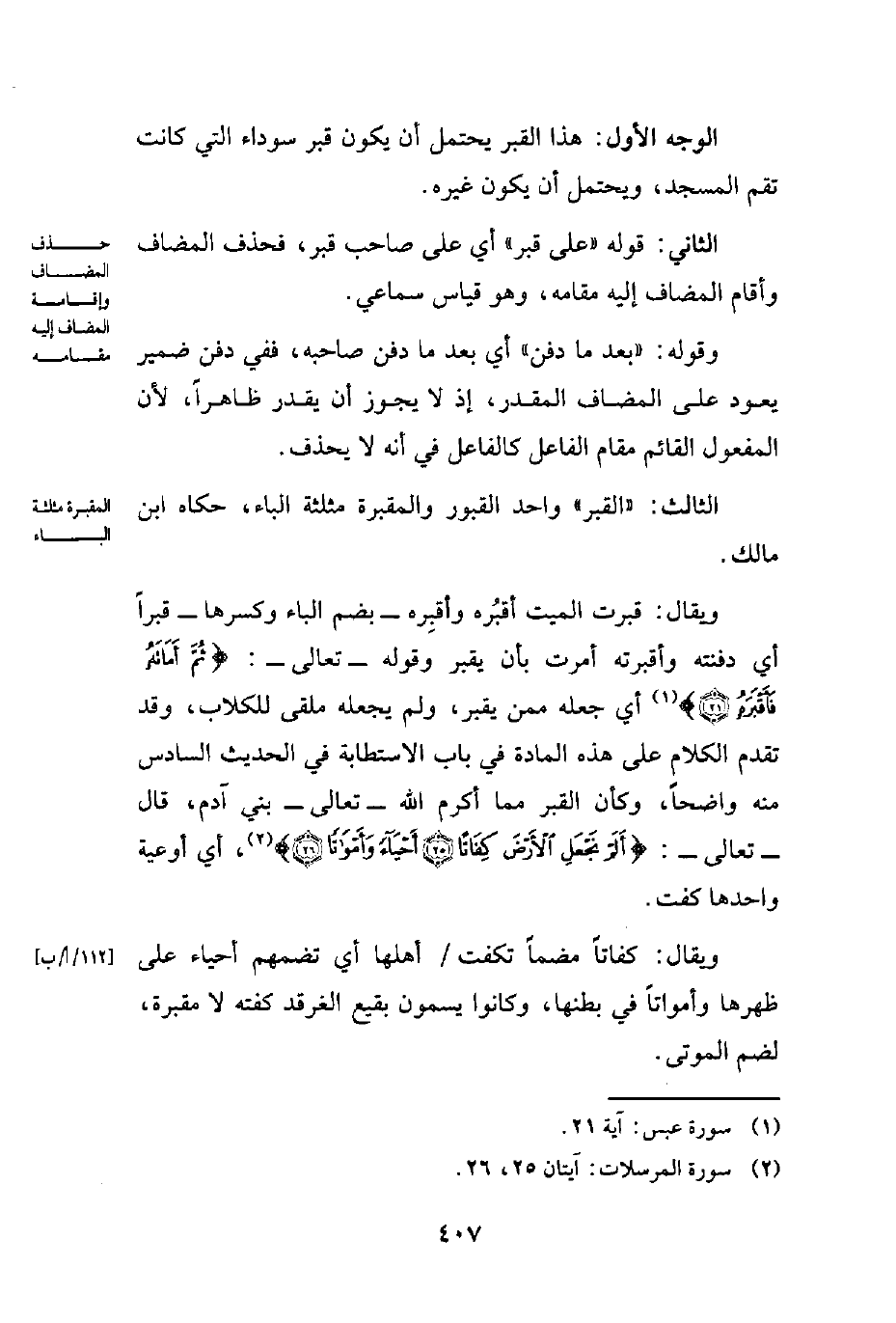 الثاني: قوله "على قبر" أي على صاحب قبر، فحذف المضاف وأقام المضاف إليه مقامه، وهو قياس سماعي.