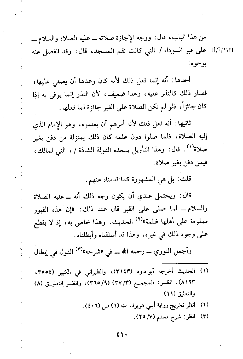 من هذا الباب، قال: ووجه الإِجازة صلاته - عليه الصلاة والسلام - على قبر السوداء التي كانت تقم المسجد، قال: وقد انفصل عنه بوجوه: