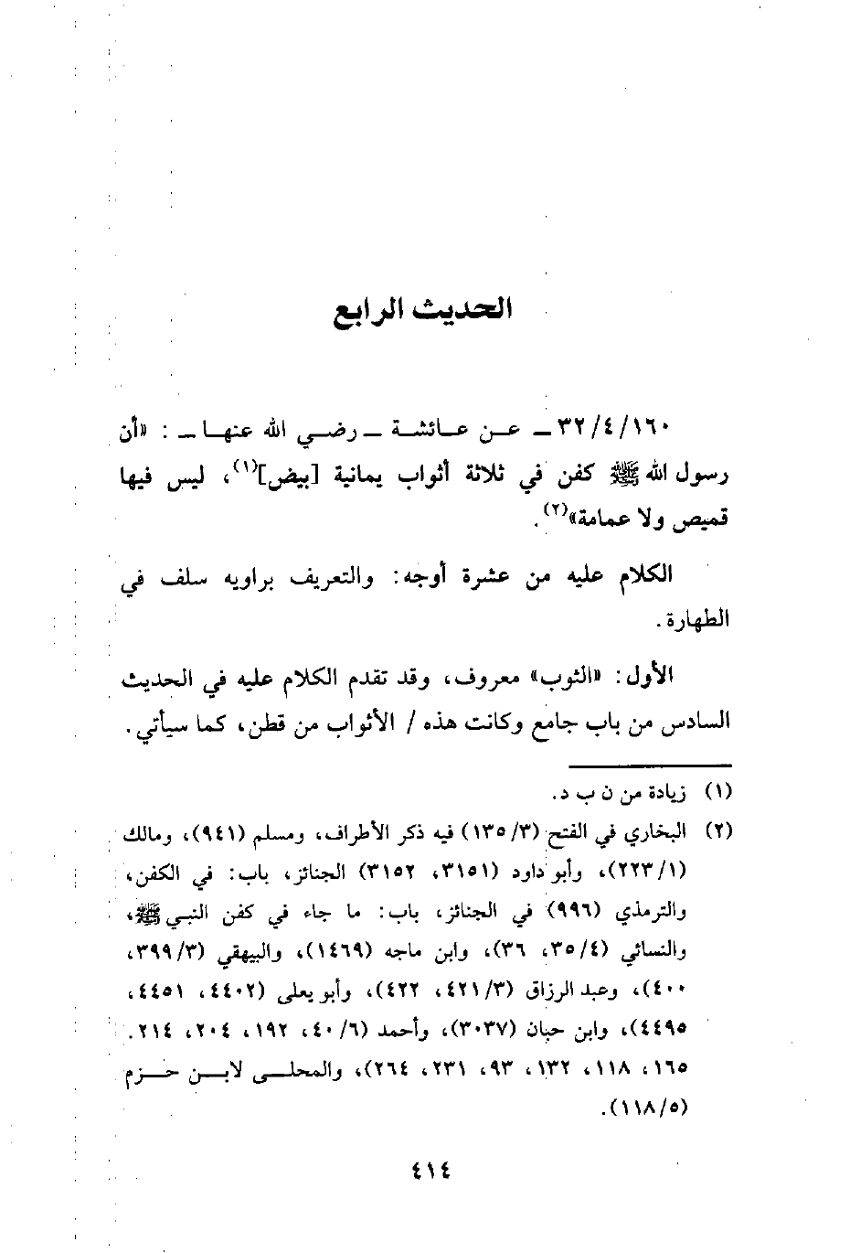 160/ 4/ 32 - عن عائشة - رضي الله عنها -: "أن رسول الله - صلى الله عليه وسلم - كفن في ثلاثة أثواب يمانية [بيض] (¬1)، لبس فيها قميص ولا عمامة" (¬2).