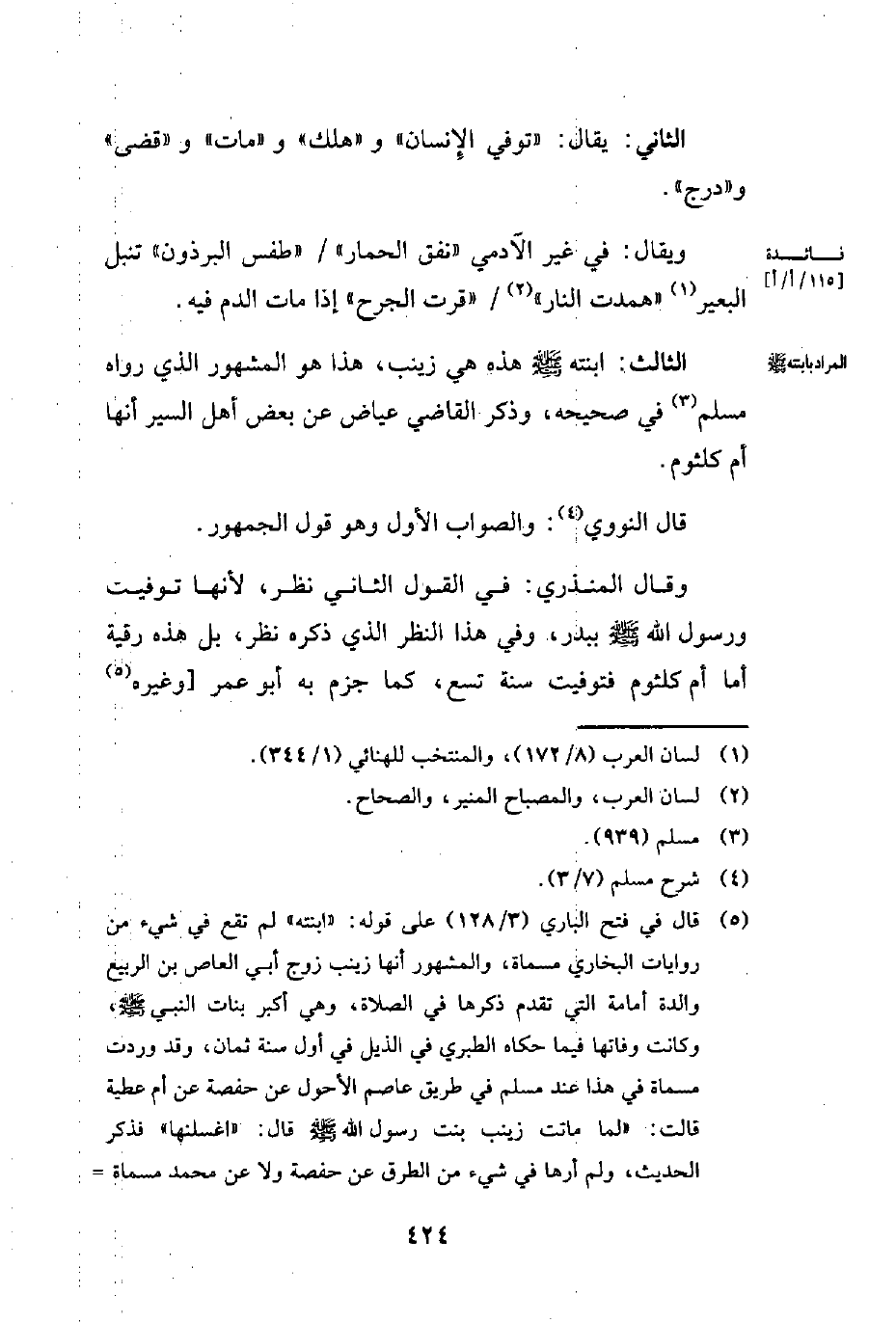 (¬5) قال في فتح الباري (3/ 128) على قوله: "ابنته" لم تقع في شيء من روايات البخاري مسماة، والمشهور أنها زينب زوج أبي العاص بن الربيع والدة أمامة التي تقدم ذكرها في الصلاة، وهي أكبر بنات النبي -صلى الله عليه وسلم، وكانت وفاتها فيما حكاه الطبري في الذيل في أول سنة ثمان، وقد وردت مسماة في هذا عند مسلم في طريق عاصم الأحول عن حفصة عن أم عطية قالت: "لما ماتت زينب بنت رسول الله - صلى الله عليه وسلم - قال: "اغسلنها" فذكر الحدث، ولم أرها في شيء من الطرق عن حفصة ولا عن محمد مسماة =