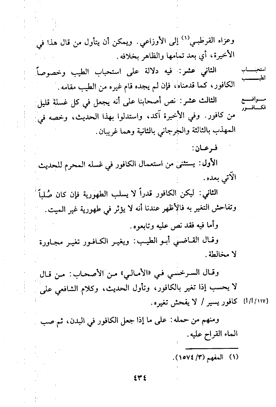 الثالث عشر: نص أصحابنا على أنه يجعل في كل غسلة قليل من كافور. وفي الأخيرة آكد، واستدلوا بهذا الحديث، وخصه في المهذب بالثالثة والجرجاني بالثانية وهما غريبان.