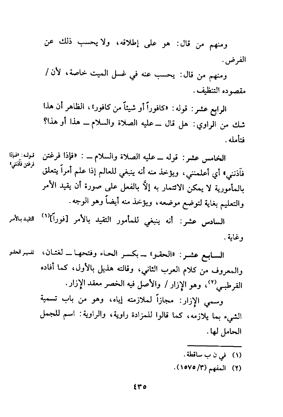 السابع عشر: "الحقو" -بكسر الحاء وفتحها- لغتان، والمعروف من كلام العرب الثاني، وقالته هذيل بالأول، كما أفاده القرطبي (¬2)، وهو الإِزار والأصل فيه الخصر معقد الأزار.
