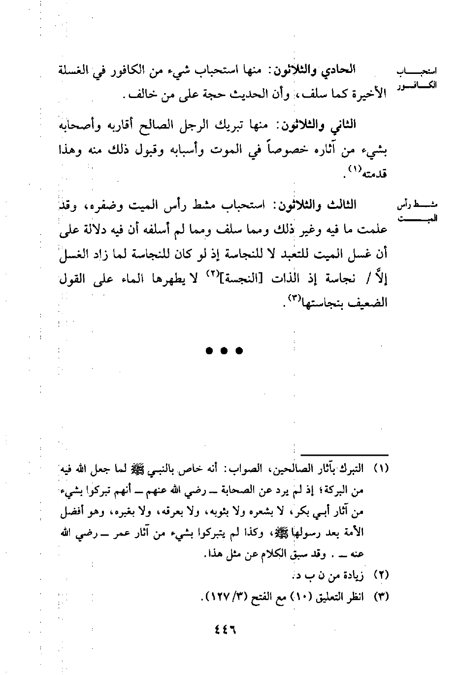 (¬1) التبرك بآثار الصالحين، الصواب: أنه خاص بالنبي - صلى الله عليه وسلم - لما جعل الله فيه من البركة؛ إذ لم يرد عن الصحابة - رضي الله عنهم - أنهم تبركوا بشيء من آثار أبي بكر، لا بشعره ولا بثوبه، ولا بعرقه، ولا بغيره، وهو أفضل الأمة بعد رسولها - صلى الله عليه وسلم -، وكذا لم يتبركوا بشيء من آثار عمر - رضي الله عنه -. وقد سبق الكلام عن مثل هذا.