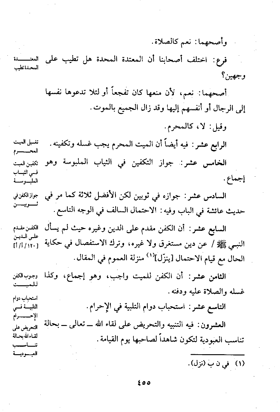 السابع عشر: أن الكفن مقدم على الدين وغيره حيث لم يسأل النبي - صلى الله عليه وسلم - عن دين مستغرق ولا غيره، وترك الاستفصال في حكاية الحال مع قيام الاحتمال [ينزّل] (¬1) منزلة العموم في المقال.