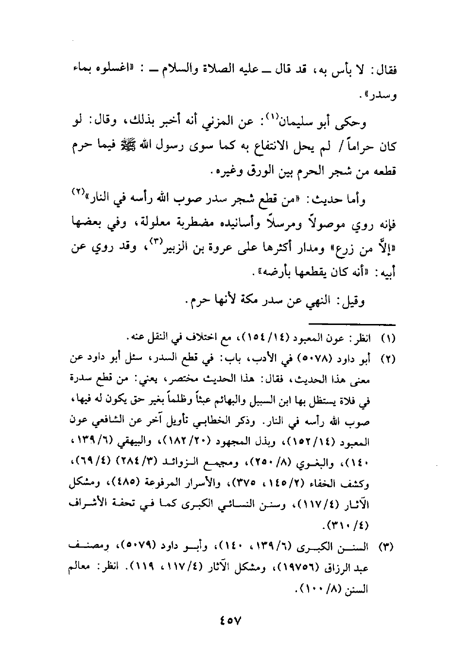 (¬2) أبو داود (5078) في الأدب، باب: في قطع السدر، سئل أبو داود عن معنى هذا الحديث، فقال: هذا الحدث مختصر، يعني: من قطع سدرة في فلاة يستظل بها ابن السبيل والبهائم عبثًا وظلمًا بغير حق يكون له فيها، صوب الله رأسه في النار. وذكر الخطابي تأويل آخر عن الشافعي عون المعبود (14/ 152)، وبذل المجهود (20/ 182)، والبيهقي (6/ 139، 140)، والبغوي (8/ 250)، ومجمع الزوائد (3/ 284) (4/ 69)، وكشف الخفاء (2/ 145، 375)، والأسرار المرفوعة (485)، ومشكل الآثار (4/ 117)، وسنن النسائي الكبرى كما في تحفة الأشراف (4/ 310).