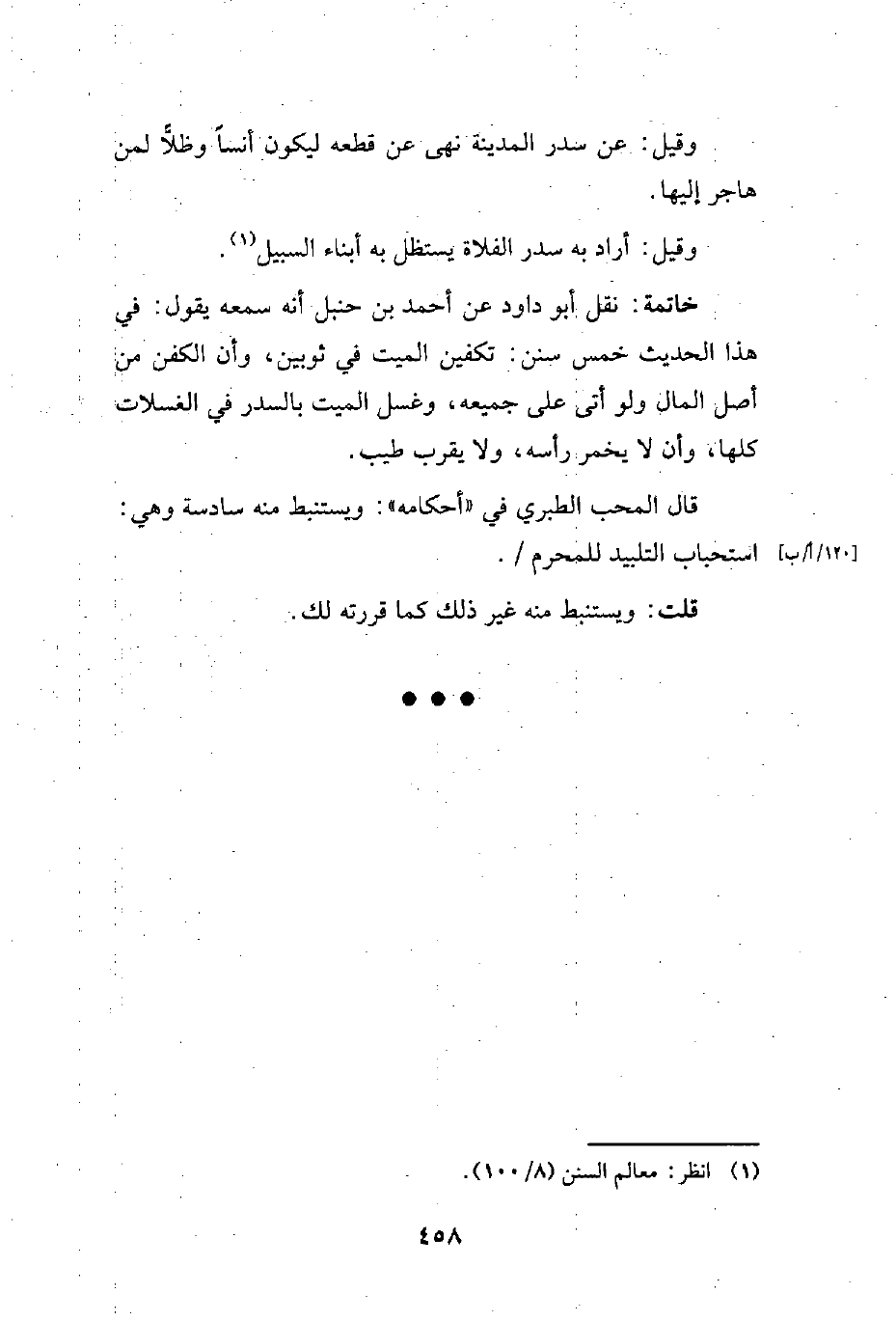 خاتمة: نقل أبو داود عن أحمد بن حنبل أنه سمعه يقول: في هذا الحديث خمس سنن: تكفين الميت في ثوبين، وأن الكفن من أصل المال ولو أتى على جميعه، وغسل الميت بالسدر في الغسلات كلها، وأن لا يخمر رأسه، ولا يقرب طيب.
