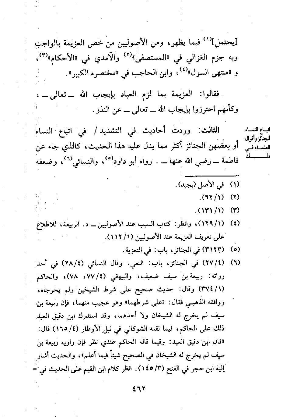 الثالث: وردت أحاديث في التشديد في اتباع النساء أو بعضهن الجنائز أكثر مما يدل عليه هذا الحديث، كالذي جاء عن فاطمة - رضي الله عنها -. رواه أبو داود (¬5)، والنسائي (¬6)، وضعفه