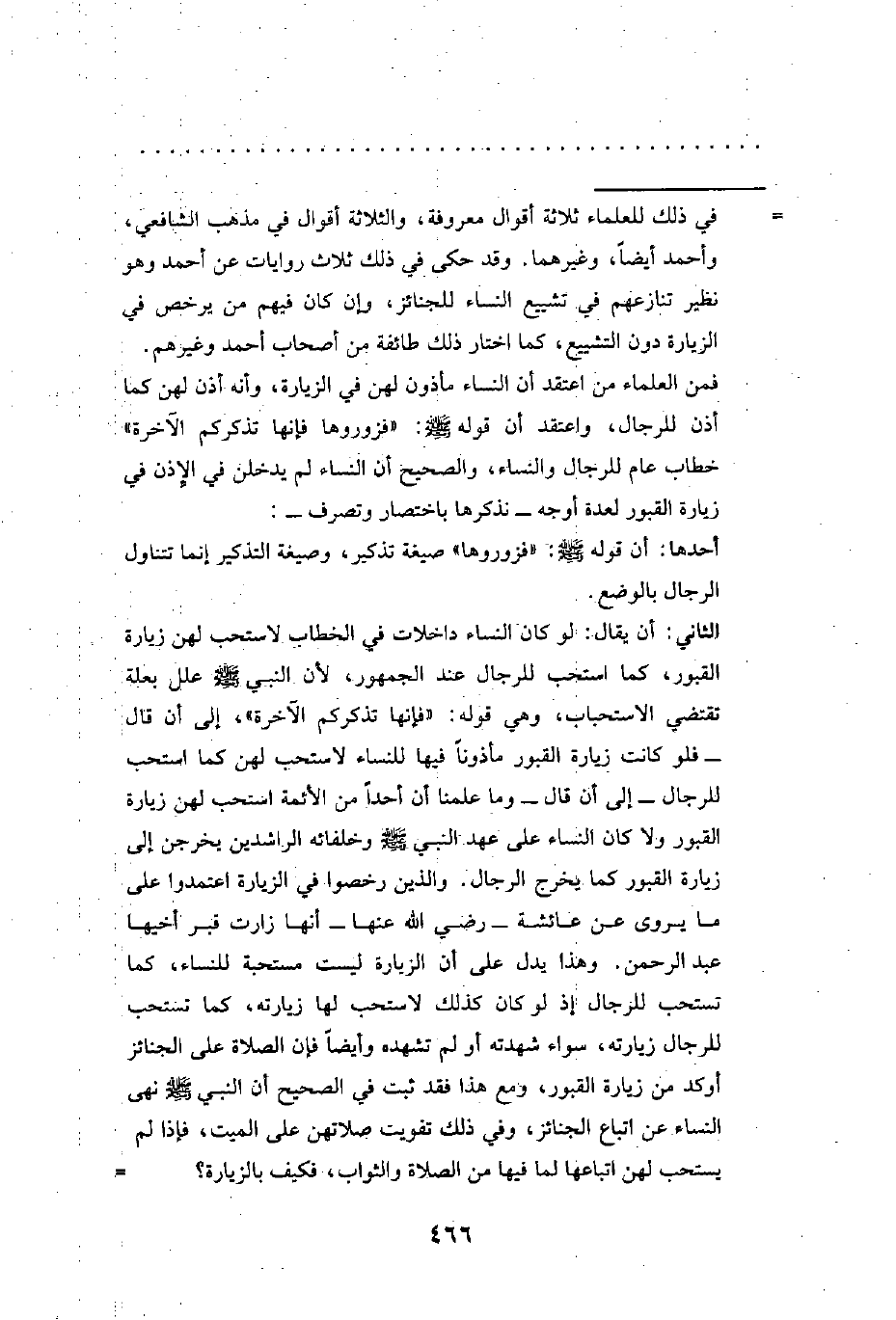= في ذلك للعلماء ثلاثة أقوال معروفة، والثلاثة أقوال في مذهب الشافعي، وأحمد أيضًا، وغيرهما. وقد حكى في ذلك ثلاث روايات عن أحمد وهو نظير تنازعهم في تشييع النساء للجنائز، وإن كان فيهم من يرخص في الزيارة دون التشييع، كما اختار ذلك طائفة من أصحاب أحمد وغيرهم.