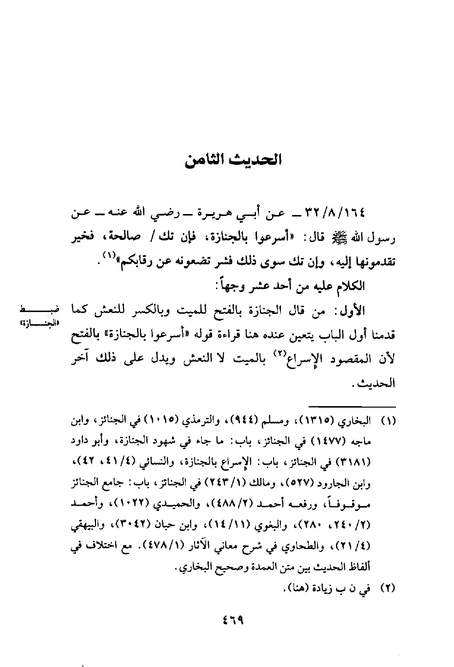 (¬1) البخاري (1315)، ومسلم (944)، والترمذي (1015) في الجنائز، وابن ماجه (1477) في الجنائز، باب: ما جاء في شهود الجنازة، وأبو داود (3181) في الجنائز، باب: الإسراع بالجنازة، والنسائي (4/ 41، 42)، وابن الجارود (527)، ومالك (1/ 243) في الجنائز، باب: جامع الجنائز موقوفاً، ورفعه أحمد (2/ 488)، والحميدي (1022)، وأحمد (2/ 240، 280)، والبغوي (11/ 14)، وابن حبان (3042)، والبيهقي (4/ 21)، والطحاوي في شرح معاني الآثار (1/ 478). مع اختلاف في ألفاظ الحديث بين متن العمدة وصحيح البخاري.
