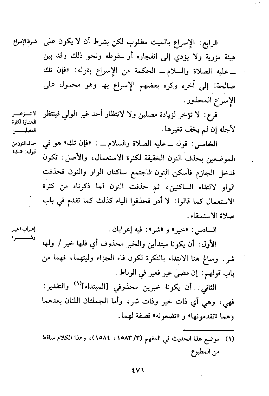 الرابع: الإِسراع بالميت مطلوب لكن بشرط أن لا يكون على هيئة مزرية ولا يؤدي إلى انفجاره أو سقوطه ونحو ذلك وقد بين -عليه الصلاة والسلام- الحكمة من الإِسراع بقوله: "فإن تك صالحة" إلى آخره وكره بعضهم الإِسراع بها وهو محمول على الإِسراع المحذور.