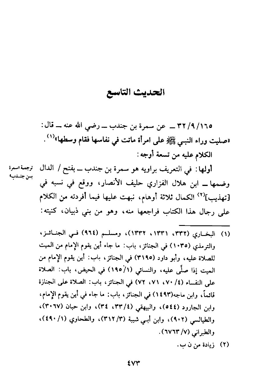 (¬1) البخاري (332، 1331، 1332)، ومسلم (964) في الجنائز، والترمذي (1035) في الجنائز، باب: ما جاء أين يقوم الإِمام من الميت للصلاة عليه، وأبو داود (3195) في الجنائز، باب: أين يقوم الإِمام من الميت إذا صلَّى عليه، والنسائي (1/ 195) في الحيض، باب: الصلاة على النفساء (4/ 70، 71، 72) في الجنائز، باب: الصلاة على الجنازة قائماً، وابن ماجه (1493) في الجنائز، باب: ما جاء في أين يقوم الإِمام، وابن الجارود (544)، والبيهقي (4/ 33، 34)، وابن حبان (3067)، والطيالسي (902)، وابن أبي شيبة (3/ 312)، والطحاوي (1/ 490)، والطبراني (7/ 6763).