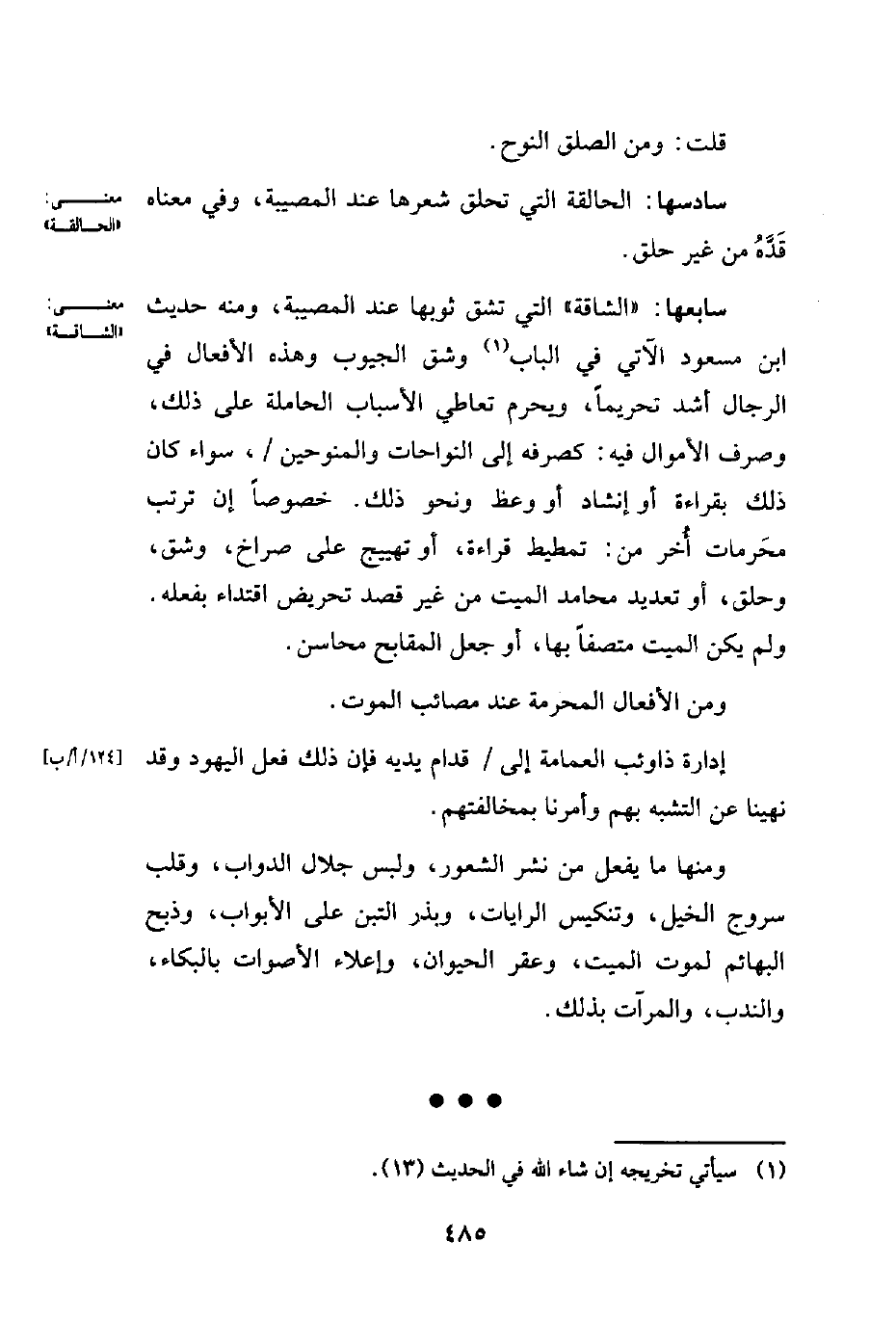 ومنها ما يفعل من نشر الشعور، ولبس جلال الدواب، وقلب سروج الخيل، وتنكيس الرايات، وبذر التبن علي الأبواب، وذبح البهائم لموت الميت، وعقر الحيوان، وإعلاء الأصوات بالبكاء، والندب، والمرآت بذلك.