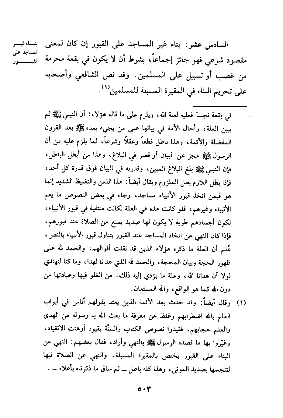 (¬1) وقال أيضاً: وقد حدث بعد الأئمة الذين يعتد بقولهم أناس في أبواب العلم بالله اضطرابهم وغلظ عن معرفة ما بعث الله به رسوله من الهدى والعلم حجابهم، فقيدوا نصوص الكتاب والسنَّة بقيود أوهنت الانقياد، وغيّروا بها ما قصده الرسول - صلى الله عليه وسلم - بالنهي وأراد، فقال بعضهم: النهي عن البناء على القبور يختص بالمقبرة المسبلة، والنهي عن الصلاة فيها لتنجسها بصديد الموتى، وهذا كله باطل -ثم ساق ما ذكرناه بأعلاه-.