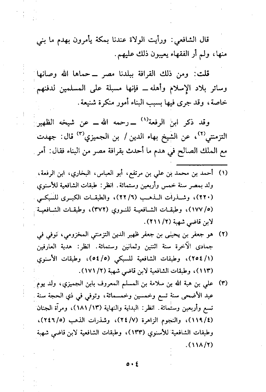 وقد ذكر ابن الرفعة (¬1) -رحمه الله- عن شيخه الظهير التزمنتي (¬2)، عن الشيخ بهاء الدين بن الجميزي (¬3) قال: جهدت مع الملك الصالح في هدم ما أحدث بقرافة مصر من البناء فقال: أمر