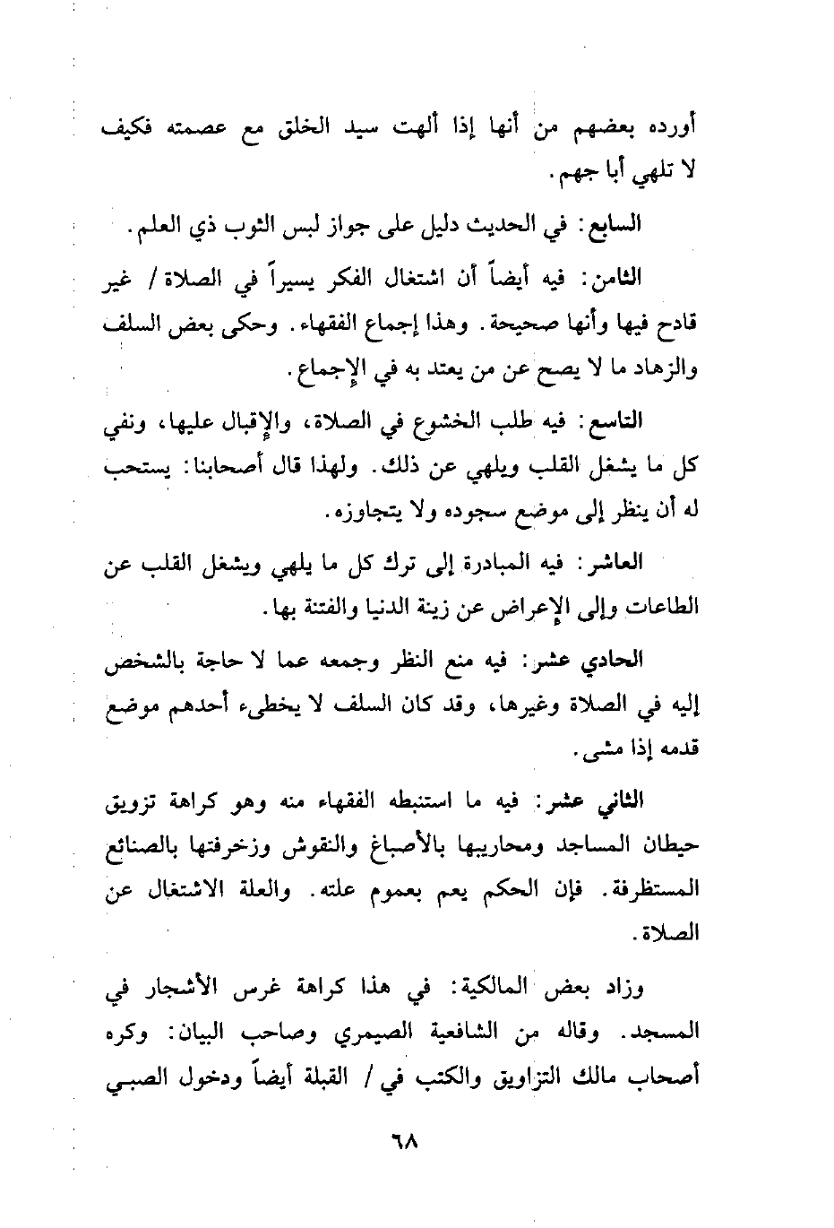 التاسع: فيه طلب الخشوع في الصلاة، والإِقبال عليها، ونفي كل ما يشغل القلب ويلهي عن ذلك. ولهذا قال أصحابنا: يستحب