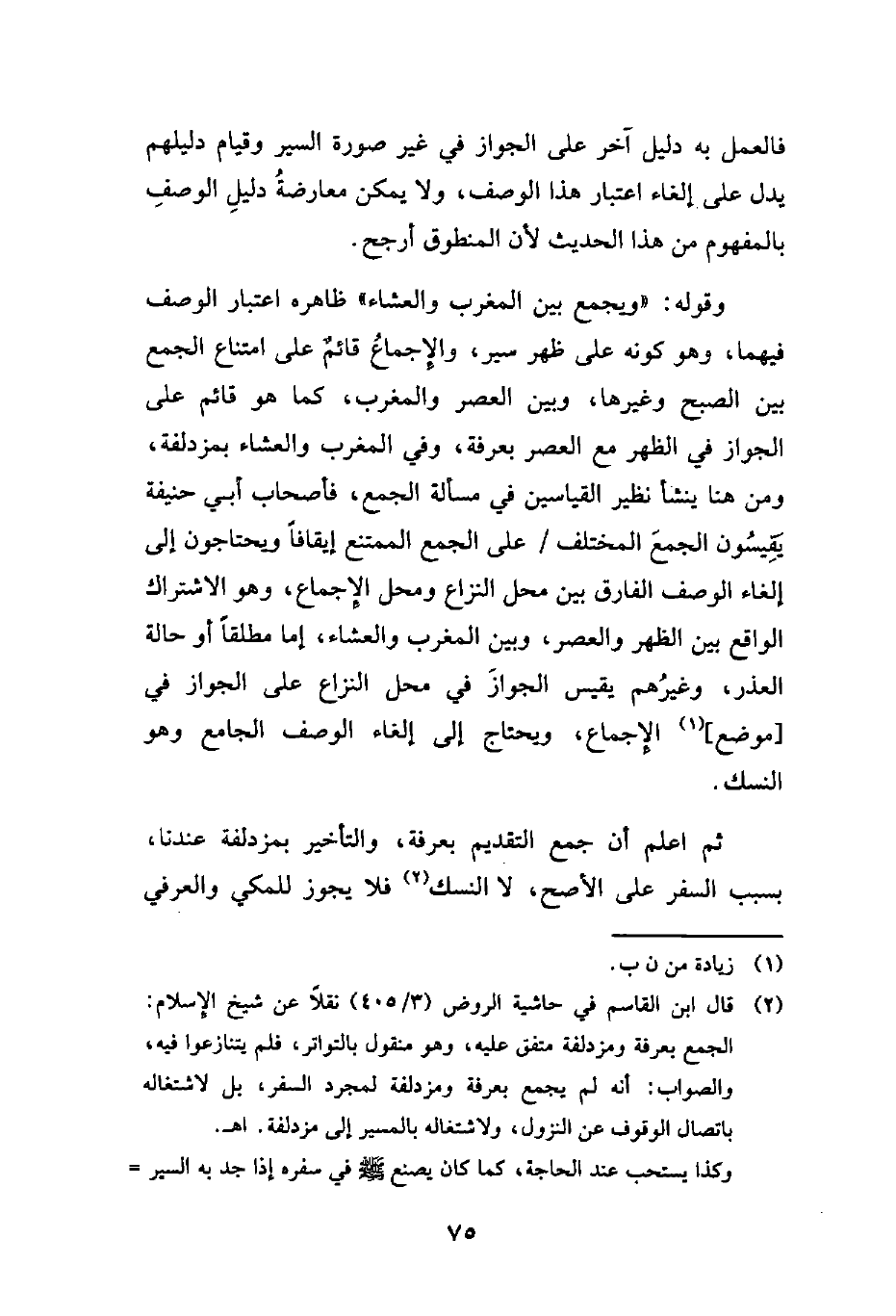 (¬2) قال ابن القاسم في حاشية الروض (3/ 405) نقلًا عن شيخ الإِسلام: الجمع بعرفة ومزدلفة متفق عليه، وهو منقول بالتواتر، فلم يتنازعوا فيه، والصواب: أنه لم يجمع بعرفة ومزدلفة لمجرد السفر، بل لاشتغاله باتصال الوقوف عن النزول، ولاشتغاله بالمسير إلى مزدلفة. اهـ.