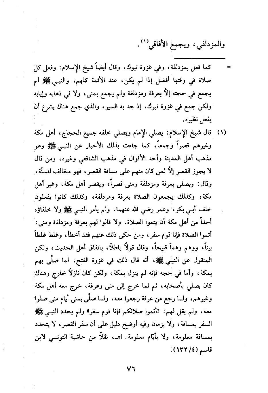 = كما فعل بمزدلفة، وفي غزوة تبوك، وقال أيضًا شيخ الإِسلام: وفعل كل صلاة في وقتها أفضل إذا لم يكن، عند الأئمة كلهم، والنبي - صلى الله عليه وسلم - لم يجمع في حجته إلَّا بعرفة ومزدلفة ولم يجمع بمنى، ولا في ذهابه وإيابه ولكن جمع في غزوة تبوك، إذ جد به السير، والذي جمع هناك يشرع أن يفعل نظيره.