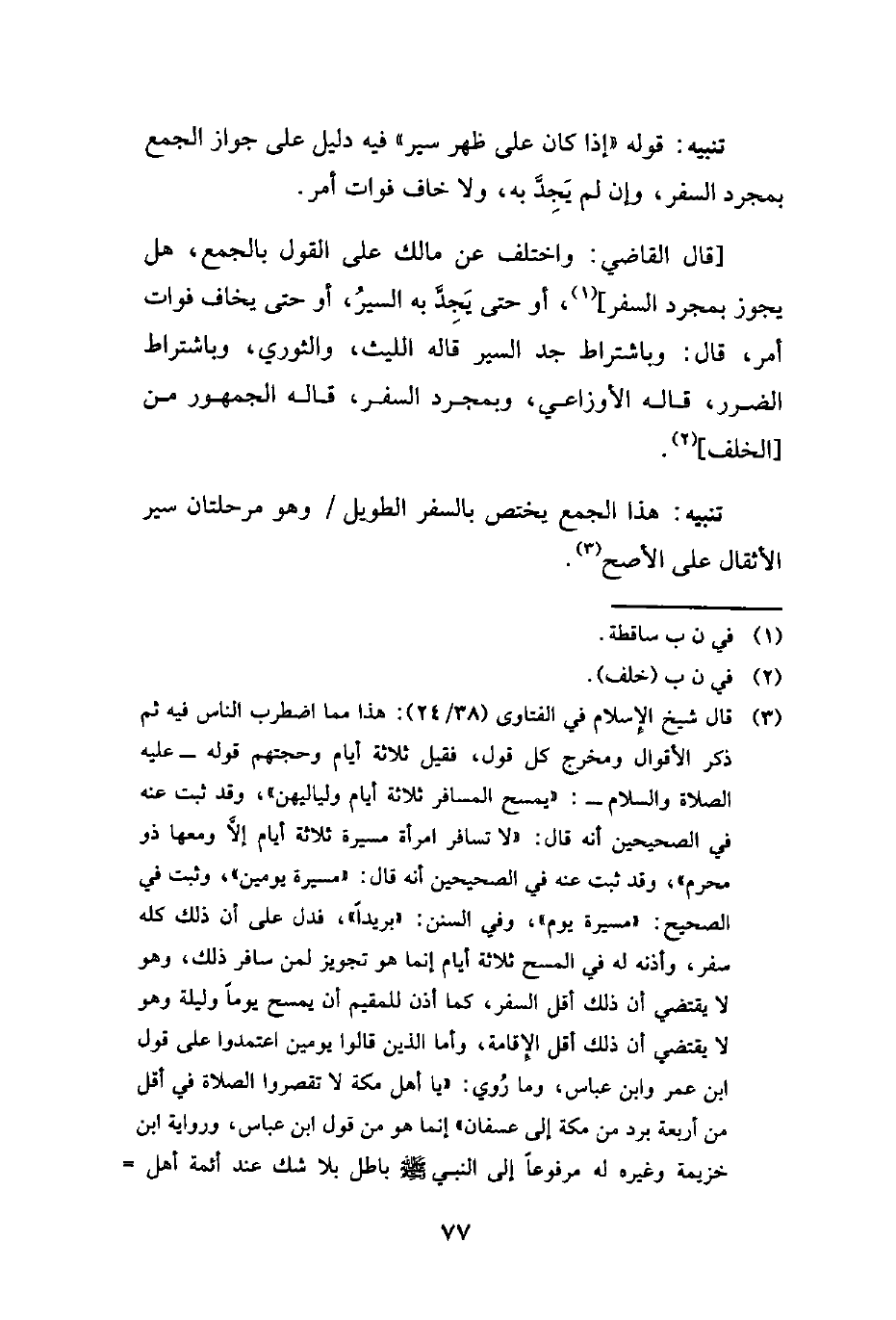 (¬3) قال شيخ الإِسلام في الفتاوى (38/ 24): هذا مما اضطرب الناس فيه ثم ذكر الأقوال ومخرج كل قول، فقيل ثلاثة أيام وحجتهم قوله - عليه الصلاة والسلام -: "يمسح المسافر ثلاثة أيام ولياليهن"، وقد ثبت عنه في الصحيحين أنه قال: "لا تسافر امرأة مسيرة ثلاثة أيام إلَّا ومعها ذو محرم"، وقد ثبت عنه في الصحيحين أنه قال: "مسيرة يومين"، وثبت في الصحيح: "مسيرة يوم"، وفي السنن: "بريدًا"، فدل على أن ذلك كله سفر، وأذنه له في المسح ثلاثة أيام إنما هو تجويز لمن سافر ذلك، وهو لا يقضي أن ذلك أقل السفر، كما أذن للمقيم أن يمسح يومًا وليلة وهو لا يقتضي أن ذلك أقل الإِقامة، وأما الذين قالوا يومين اعتمدوا على قول ابن عمر وابن عباس، وما رُوي: "يا أهل مكة لا تقصروا الصلاة في أقل من أربعة برد من مكة إلى عسفان" إنما هو من قول ابن عباس، ورواية ابن خزيمة وغيره له مرفوعًا إلى النبي - صلى الله عليه وسلم - باطل بلا شك عند أئمة أهل =