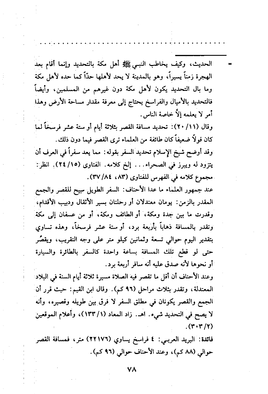 فائدة: البريد العربي: 4 فراسخ يساوي (22176) متر، فمسافة القصر حوالي (88 كم)، وعند الأحناف حوالي (96 كم).
