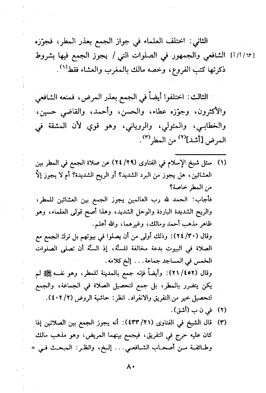 (¬1) سئل شيخ الإِسلام في الفتاوى (29/ 24) عن صلاة الجمع في المطر بين العشائين، هل يجوز من البرد الشديد؟ أو الريح الشديدة؟ أم لا يجوز إلَّا من المطر خاصة؟