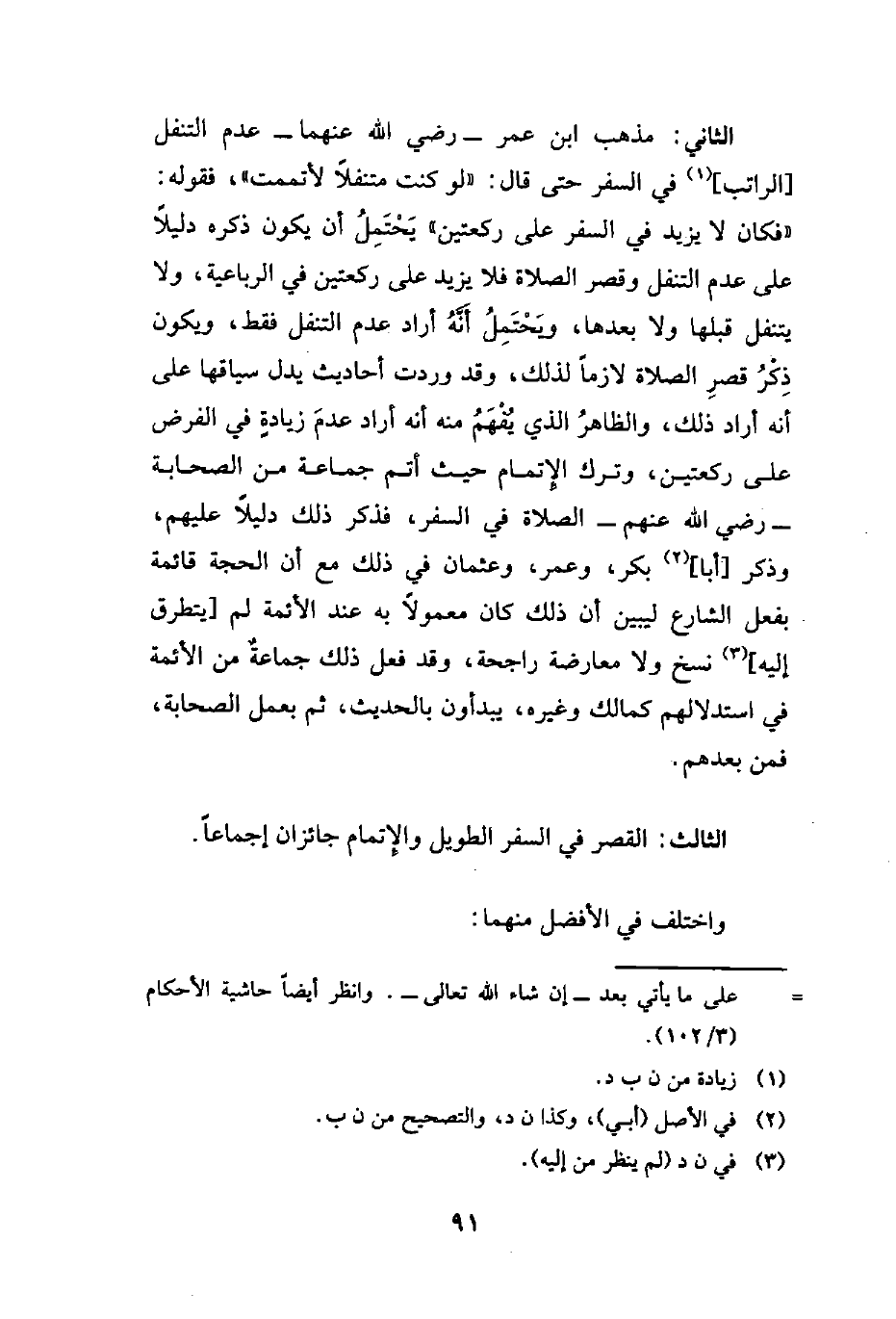 الثاني: مذهب ابن عمر - رضي الله عنهما - عدم التنفل [الراتب] (¬1) في السفر حتى قال: "لو كنت متنفلًا لأتممت"، فقوله: