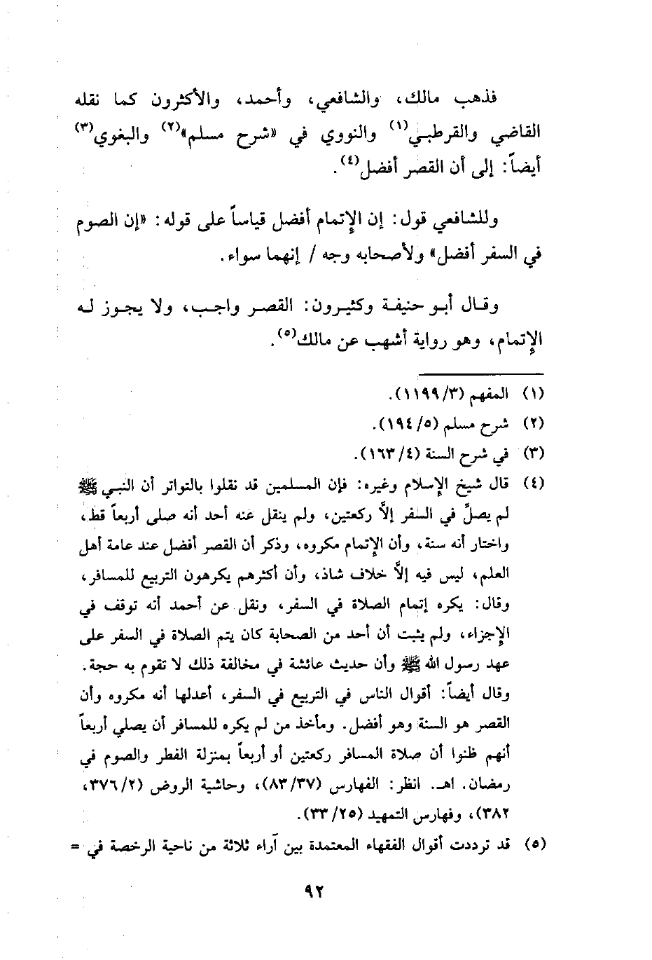 (¬4) قال شيخ الإِسلام وغيره: فإن المسلمين قد نقلوا بالتواتر أن النبي - صلى الله عليه وسلم - لم يصلِّ في السفر إلَّا ركعتين، ولم ينقل عنه أحد أنه صلى أربعًا قط، واختار أنه سنة، وأن الإِتمام مكروه، وذكر أن القصر أفضل عند عامة أهل العلم، ليس فيه إلَّا خلاف شاذ، وأن أكثرهم يكرهون التربيع للمسافر، وقال: يكره إتمام الصلاة في السفر، ونقل عن أحمد أنه توقف في الإِجزاء، ولم يثبت أن أحد من الصحابة كان يتم الصلاة في السفر على عهد رسول الله - صلى الله عليه وسلم - وأن حديث عائشة في مخالفة ذلك لا تقوم به حجة. وقال أيضًا: أقوال الناس في التربيع في السفر، أعدلها أنه مكروه وأن القصر هو السنة وهو أفضل. ومأخذ من لم يكره للمسافر أن يصلي أربعًا أنهم ظنوا أن صلاة المسافر ركعتين أو أربعًا بمنزلة الفطر والصوم في رمضان. اهـ. انظر: الفهارس (37/ 83)، وحاشية الروض (2/ 376، 382)، وفهارس التمهيد (25/ 33).