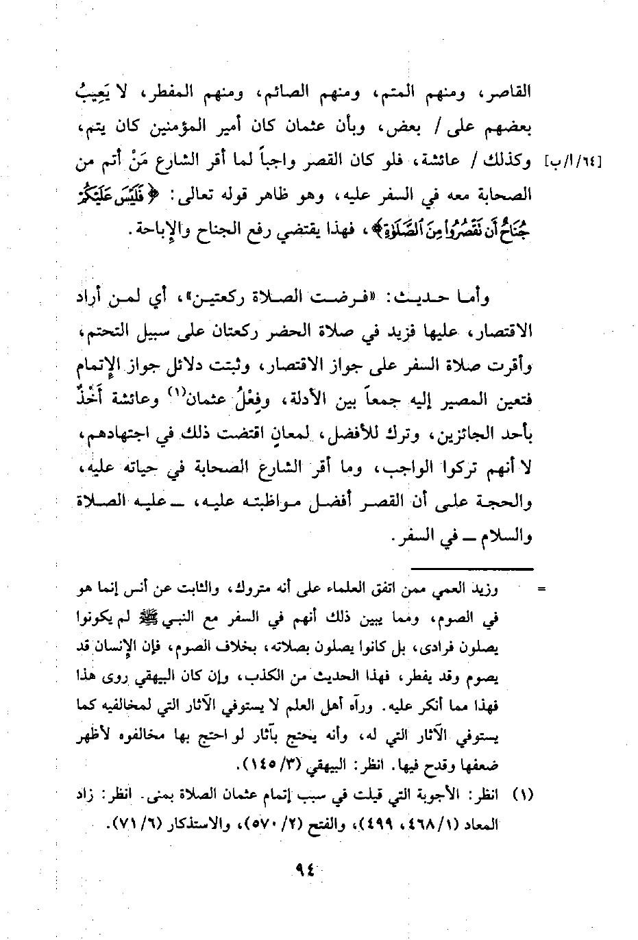 (¬1) انظر: الأجوبة التي قيلت في سبب إتمام عثمان الصلاة بمنى. انظر: زاد المعاد (1/ 468، 499)، والفتح (2/ 570)، والاستذكار (6/ 71).
