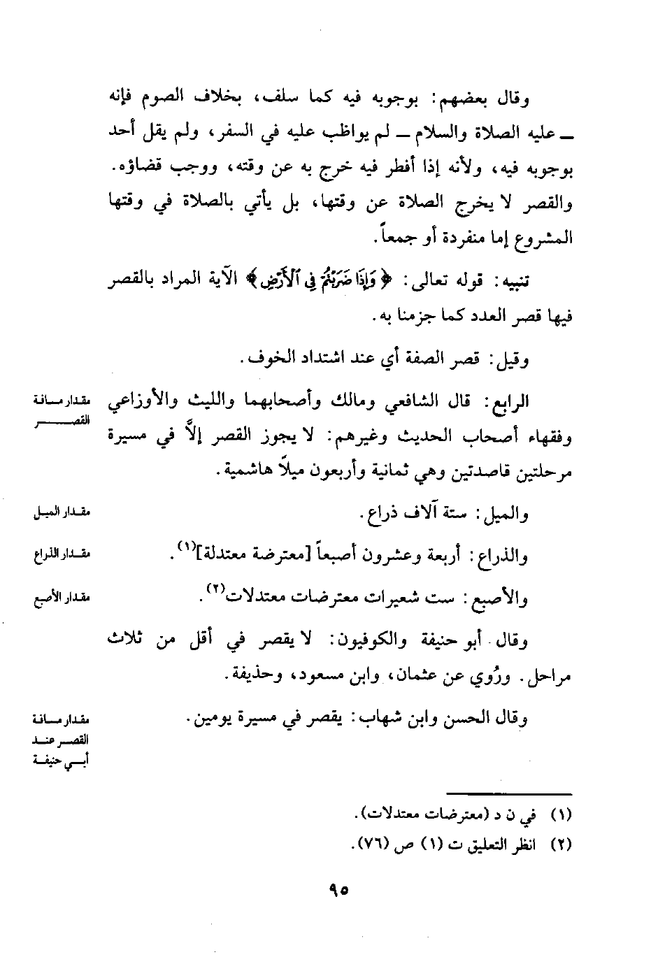 الرابع: قال الشافعي ومالك وأصحابهما والليث والأوزاعي وفقهاء أصحاب الحديث وغيرهم: لا يجوز القصر إلَّا في مسيرة مرحلتين قاصدتين وهي ثمانية وأربعون ميلًا هاشمية.