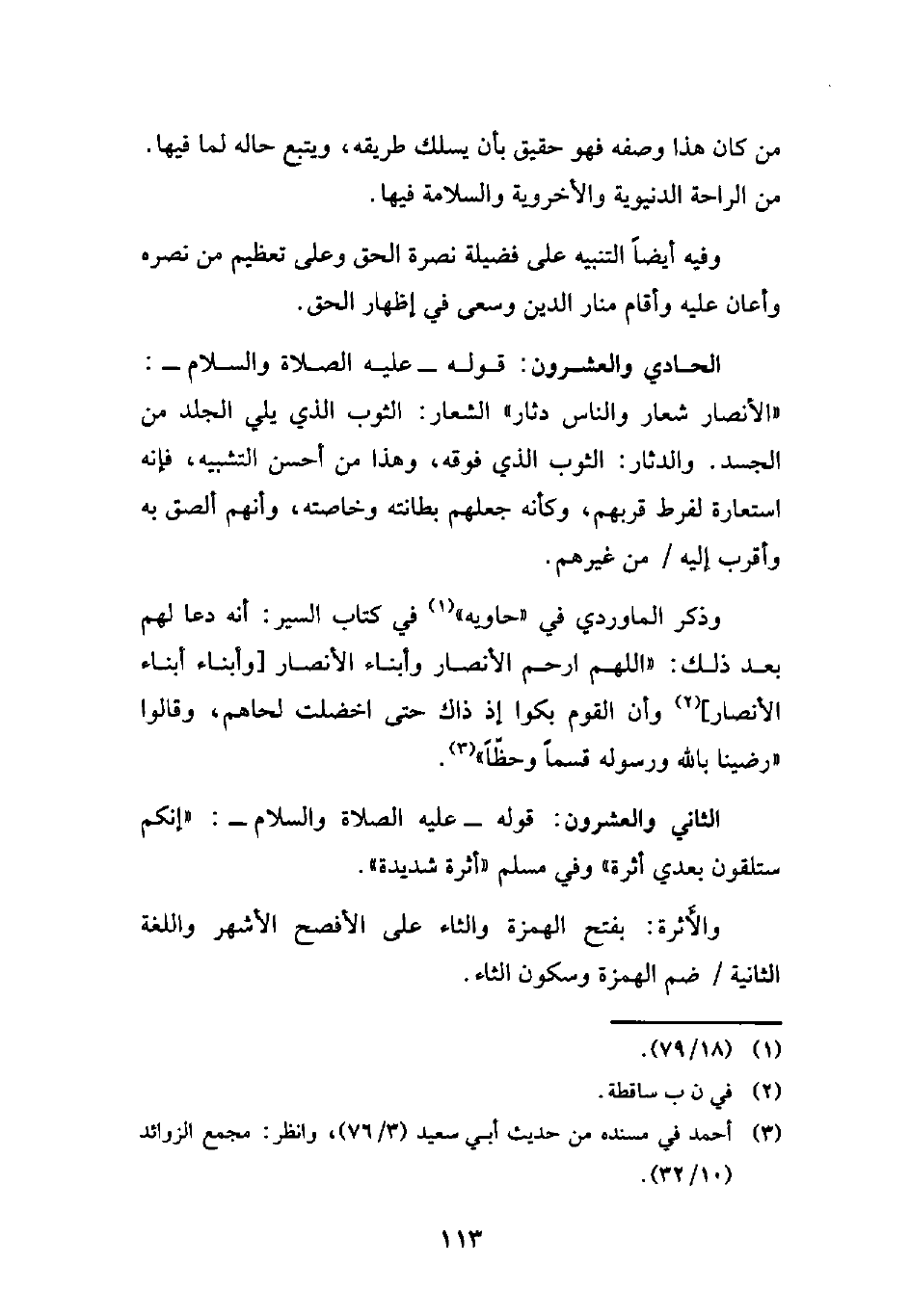 الحادي والعشرون: قوله -عليه الصلاة والسلام-: "الأنصار شعار والناس دثار" الشعار: الثوب الذي يلي الجلد من الجسد. والدثار: الثوب الذي فوقه، وهذا من أحسن التشبيه، فإنه استعارة لفرط قربهم، وكأنه جعلهم بطانته وخاصته، وأنهم ألصق به وأقرب إليه من غيرهم.