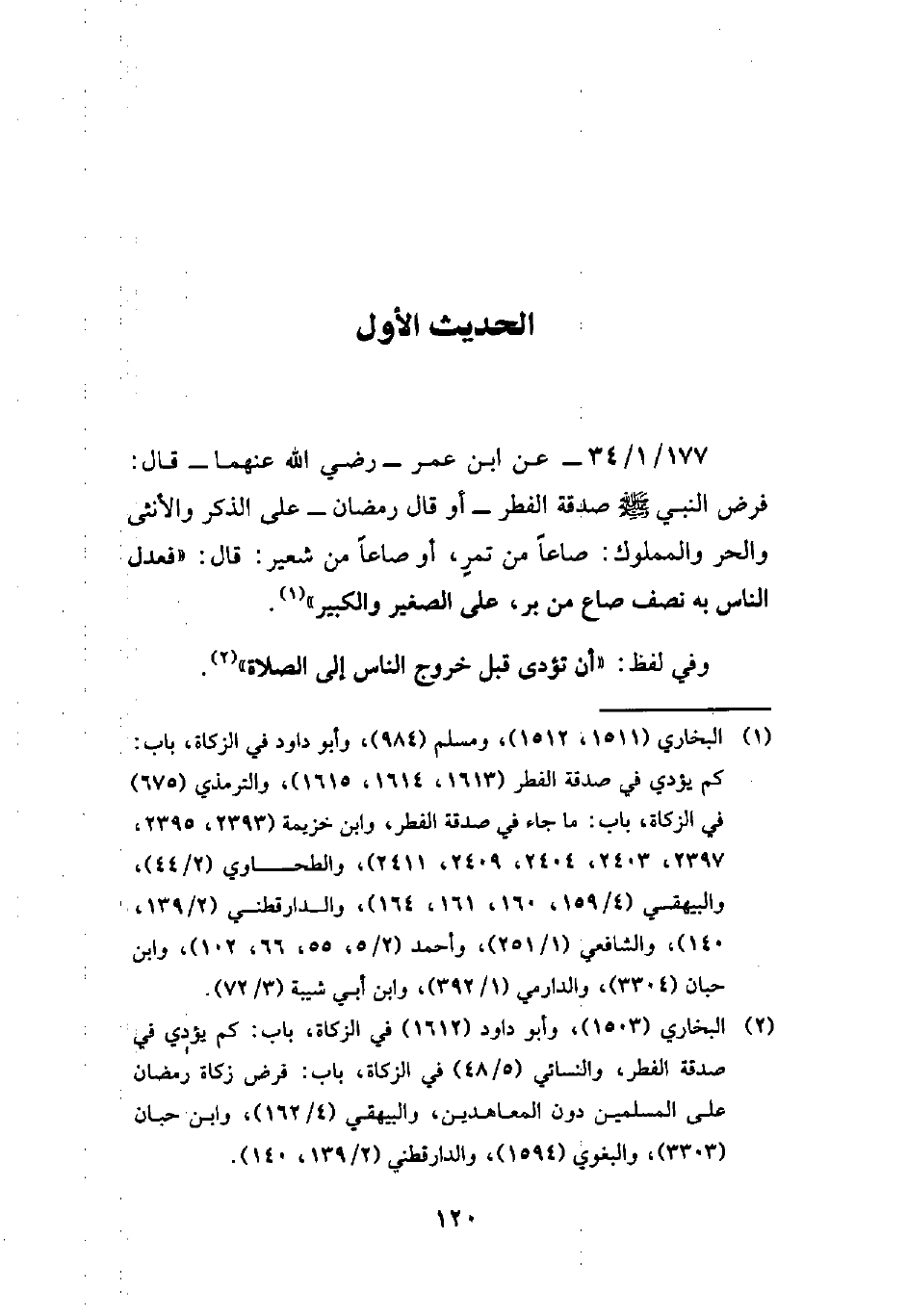 (¬1) البخاري (1511، 1512)، ومسلم (984)، وأبو داود في الزكاة، باب: كم يؤدي في صدقة الفطر (1613، 1614، 1615)، والترمذي (675) في الزكاة، باب: ما جاء في صدقة الفطر، وابن خزيمة (2393، 2395، 2397، 2403، 2404، 2409، 2411)، والطحاوي (2/ 44)، والبيهقي (4/ 159، 160، 161، 164)، والدارقطني (2/ 139، 140)، والشافعي (1/ 251)، وأحمد (2/ 5، 55، 66, 102)، وابن حبان (3304)، والدارمي (1/ 392)، وابن أبي شيبة (3/ 72).