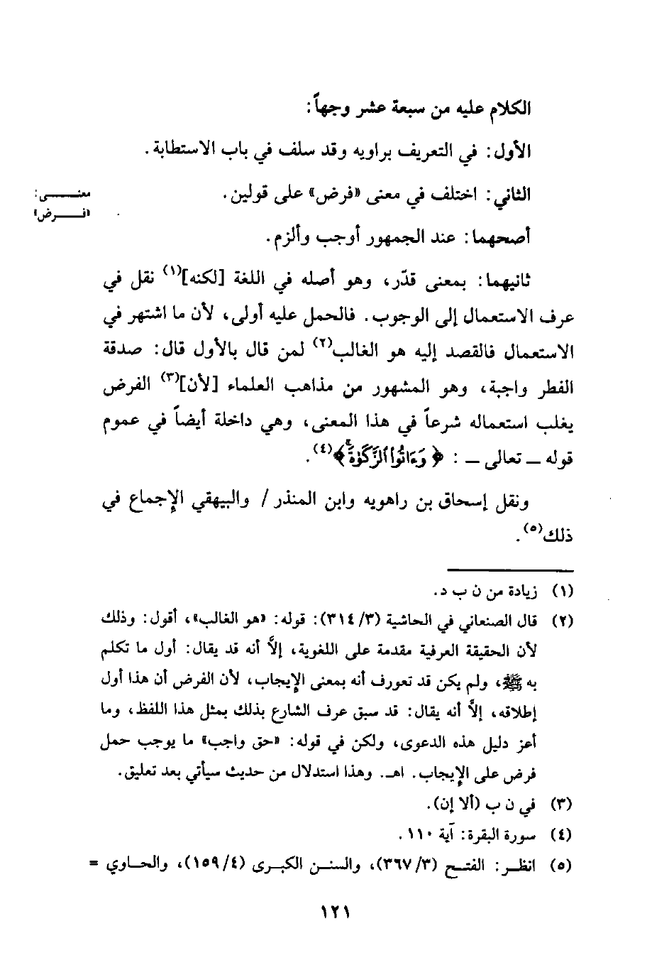ثانيهما: بمعنى قدّر، وهو أصله في اللغة [لكنه] (¬1) نقل في عرف الاستعمال إلى الوجوب. فالحمل عليه أولى، لأن ما اشتهر في الاستعمال فالقصد إليه هو الغالب (¬2) لمن قال بالأول قال: صدقة الفطر واجبة، وهو المشهور من مذاهب العلماء [لأن] (¬3) الفرض يغلب استعماله شرعاً في هذا المعنى، وهي داخلة أيضاً في عموم قوله -تعالي-: {وَآتُوا الزَّكَاةَ} (¬4).